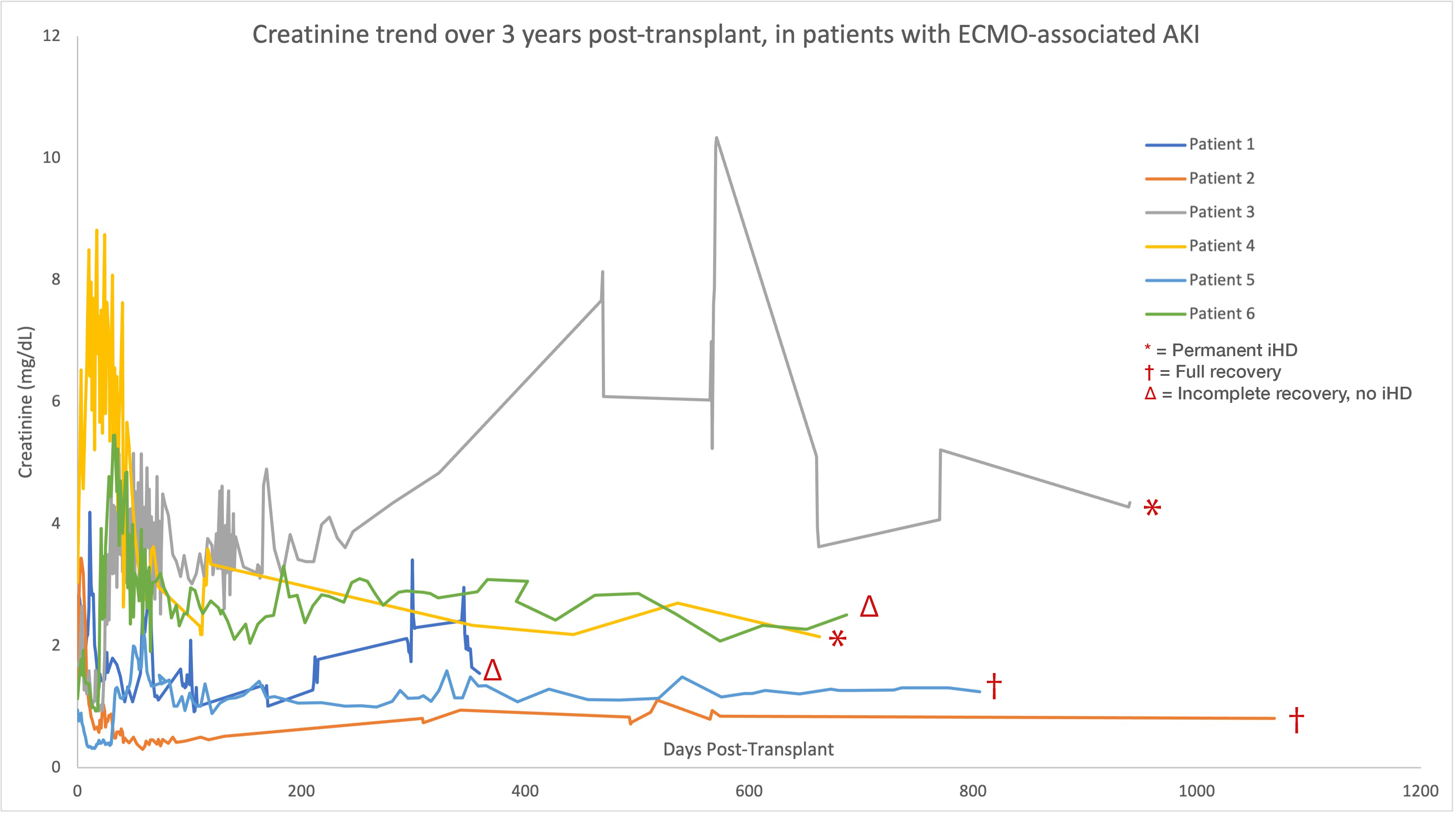 Conclusion: This study evaluated renal outcomes in patients who developed acute kidney injury while on ECMO as a bridge to lung transplantation. More than half of the patients did not require iHD within months, with the two youngest returning to their baseline creatinine. Our results suggest that AKI while on ECMO bridge may not represent an absolute contraindication to transplantation and in carefully selected patients can lead to optimal long-term outcomes.