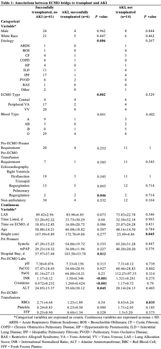 Results: Forty-seven patients were successfully bridged to transplant, with 6 (12.8%) developing an AKI pre-transplant while on ECMO (2 of the 6 required CRRT pre-transplant). Patients with AKI had different lung pathologies (p=0.006), were more likely to be on central ECMO (p=0.002) compared to those without AKI-on-ECMO BTT and had longer post-transplant hospital stay (p=0.015). Of the 39 patients who failed BTT, 14 (35.9%) developed AKI. Compared to patients successfully transplanted with AKI, the failed BTT were shorter (p=0.045) and received more transfusions while on ECMO (p=0.035). All 6 patients with AKI-on-ECMO BTT required CRRT post-transplant for between 1 and 18 days; 4 patients were transitioned to intermittent hemodialysis (iHD) prior to discharge. Long-term, 2 patients had near-complete renal recovery within 2 months following transplant, 2 patients transitioned off iHD but without return of renal function to pre-transplant baseline, and the remaining 2 continued iHD. Five patients were alive 3 years post-transplant, with 1 death due to metastatic malignancy. At 3 years, mean peak post-transplant FEV1 %-predicted was 77.6 and no significant rejection events had occurred.