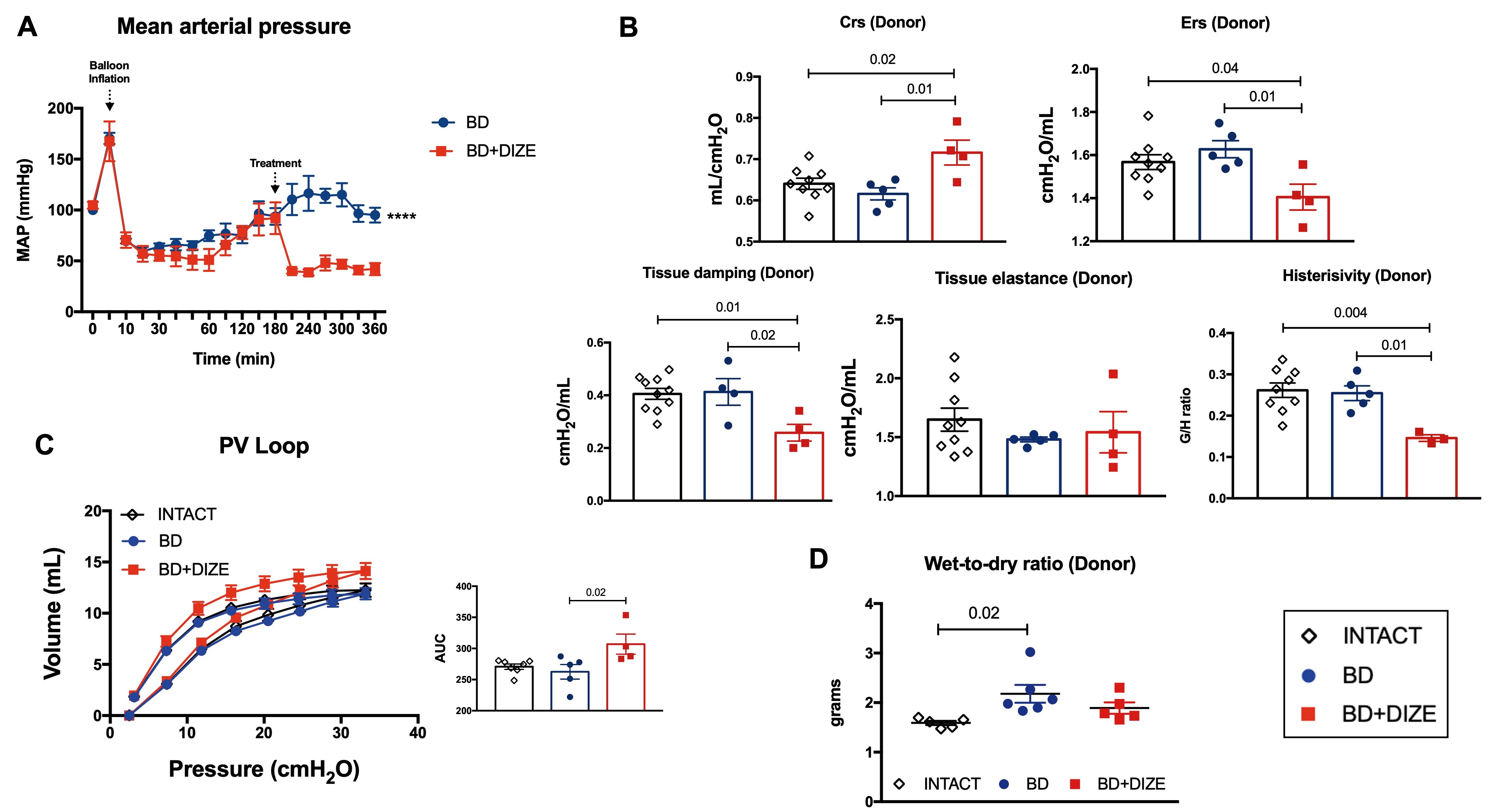 Conclusion: Our data suggests that activation of ACE2 is able to modulate donor hemodynamic and lung mechanical parameters, probably reducing tissue resistance and improving airflow in the peripheral airways, converging to a decrease in ventilation heterogeneity in the sudden onset model of brain death. Our data also indicates that DIZE attenuates pulmonary edema on grafts from BD donors after lung transplantation.