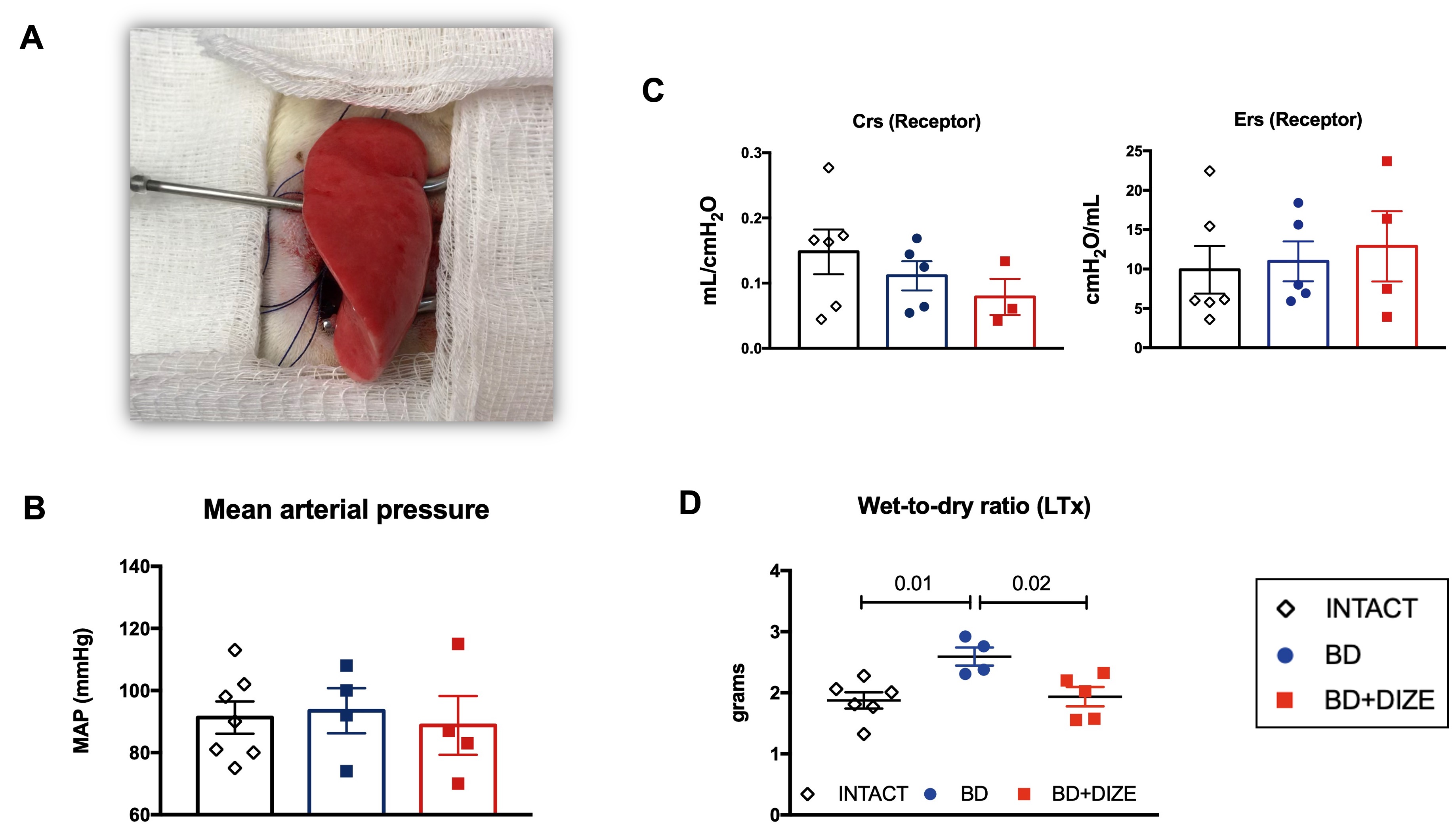 Results: The administration of DIZE, 3 hours after BD, prevented the increase in the MAP (210’ after BD-induction: BD – 110 ± 12 mmHg; n=5; BD+DIZE – 40 ± 12 mmHg; n=4 / p=0.0001) without associated blood gas and metabolic alterations. Changes in lung mechanics, such as decreased tissue damping (G) and histeresivity (n) followed by increased respiratory system compliance (Crs), were associated with BD+DIZE (G - 0,25 ± 0,03 cmH2O/mL; Crs - 0,71 ± 0,03 mL/cmH2O; n – 0,14 ± 0,008) compared to intact (G - 0,40 ± 0,02 cmH2O/mL, p = 0.01; Crs – 0,64 ± 0,01 mL/cmH2O, p = 0.02; n - 0,26 ± 0,01, p = 0.004) and BD groups (G – 0,41± 0,05 cmH2O/mL, p = 0.02; Crs – 0,61 ± 0,01 mL/cmH2O, p = 0.01; n - 0,25 ± 0,008, p = 0.01) (Figure 1). After LTx, MAP, gas exchange function, and lung mechanical parameters, were not different among the 3 groups (p>0.05). On the other hand, the DIZE treatment was capable to reduce wet-to-dry weight ratio (INTACT – 1,87 ± 0,13; BD – 2,59 ± 0,14; BD+DIZE – 1,93 ± 0,15 / p=0.01) (Figure 2).
