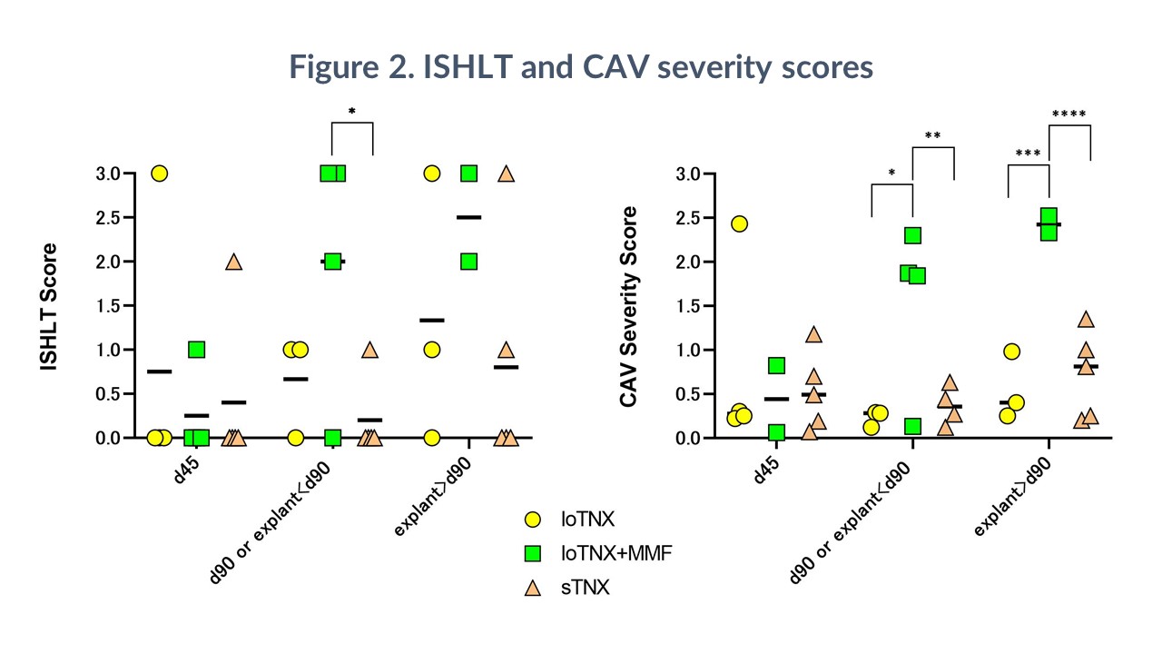 Results: sTNX (MST >232d, range 116-305) significantly prolonged cardiac allograft survival relative to hu5c8 alone (MST 133d; p=0.016), loTNX (MST 99d; p=0.014), or loTNX+MMF (MST 88d; p=0.011). All grafts treated with loTNX () or with loTNX+MMF () exhibited acute rejection histologically within 90 days, and 7 of 8 grafts failed before day 180. One sTNX graft rejected at 116d in association with bacterial infection; one graft was electively explanted at 181d; and three grafts survived for 57, 90, and 130 days after discontinuing TNX-1500. Neither sustained thrombocytopenia nor micro- or macro-vascular thrombosis were observed. At 90 days, loTNX+MMF had a significantly higher median ISHLT score (2.0) than sTNX grafts (0.2; p=0.016); loTNX+MMF also had a significantly higher median CAV score (1.8) at d90 than either loTNX (0.2; p=0.022) or sTNX (0.3; p=0.026). At subsequent graft explant or end-of-study biopsy (180d), loTNX+MMF had a higher median CAV score (2.4) than loTNX (0.4; p=0.002) or sTNX (0.8; p=0.002). sTNX suppressed the rise in Teff/Tregs ratio at the final time-point (180d or <180d if graft failure) more effectively than loTNX+MMF (3.5 ± 0.9 vs 9.5 ± 6.1, p=0.031). sTNX (5/5) but not loTNX (1/4) or loTNX+MMF (2/4) consistently prevented anti-donor antibody elaboration.