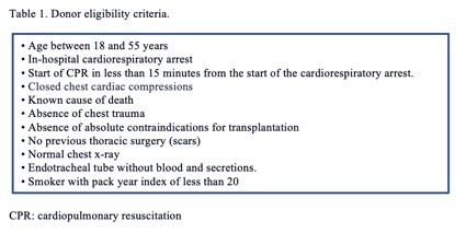 Method: To establish such type of a program, it is deemed necessary to have: a National Transplant Organization, appropriate legislation, an approved ethical framework and specialized teams of professionals. In Uruguay, organ donation and transplantation is governed by the National Institute of Donation and Transplantation (INDT). Under Law 14005, organs are allowed to be used for therapeutic purposes once irreversible pathological changes deemed incompatible with life are confirmed. The Ethics Committee has agreed that the treating physicians (independent from INDT) are those responsible for confirming the patient’s decease upon a cardiac arrest, and once CPR procedures have proved unsuccessful. Upon confirmation of patient’s decease, DCD lung donation is considered. INDT is called in, being responsible for donor selection (Table 1) and conducting the legal procedures. 500 units/kg of heparin are administered plus 10 cycles of closed cardiac massages. 300 cc of venous blood are then extracted, which are stored in a transfusion blood bag. Samples are taken for serology purposes, routinary procedures and chest x-ray performed. Chest tube placement in each hemithorax, second intercostal space, clavicular middle line. Maximum time between the cardiorespiratory arrest start and tube placement: 120 minutes. 6 litres of Perfadex® preservation solution or cool normal saline at 4 ºC is then introduced in each hemithorax. Next, Ventilator is switched-off. This way, the collapsed lung is maintained cool in a preservation solution until lung is removed in the operating room. Maximum time between topical preservation starts and lung removal begins: 240 minutes. Inside the operating room, drainage of both hemithorax is conducted. Ventilation starts at FIO2 100% and 5-cm H2O PEEP. Bronchoscopy is performed if needed. Cannulation of pulmonary artery and drainage of left auricle. Lavage is performed until clear liquid is obtained. Infusion through pulmonary artery of venous blood previously extracted with E2 prostaglandin. Blood gas is then extracted at the entrance, through the pulmonary artery and the affluent of each of the lung veins. If PaO2 difference between both samples is > 300 mmHg, then these are transplant-eligible lungs. Organ procurement and preservation is done through normal procedure.