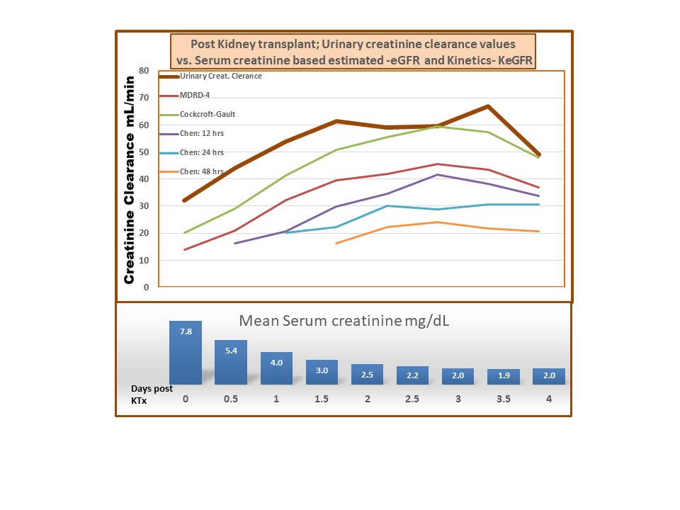 Introduction: Post kidney transplant (KTx) with functioning renal allograft, serum creatinine continues to decrease at a variable rate until it stabilizes. Currently, the Cockcroft- Gault (C-G) and Modification of Diet in Renal Disease MDRD-4 formulae, and are based on a single serum creatinine value to estimate GFR for chronic kidney disease. For rapid changes in serum creatinine, the kinetic estimated GFR (KeGFR)1 formula was developed for recovering acute kidney injury. However, post-KTx with functioning allograft eGFR and KeGFR formulae/calculators’ values are not compared with measured urinary creatinine clearance by any glomerular isotope excretion methods. Hence, the medications requiring dose adjustment based on renal function might not be adjusted appropriately. The aim of the present study is to compare actual urinary creatinine clearance every 12 hours with C-G, MDRD-4, and (KeGFR) after functional KTx.