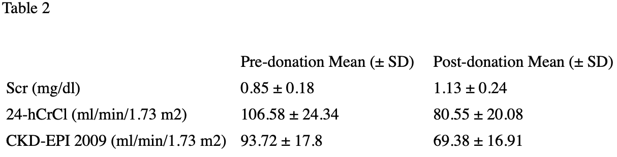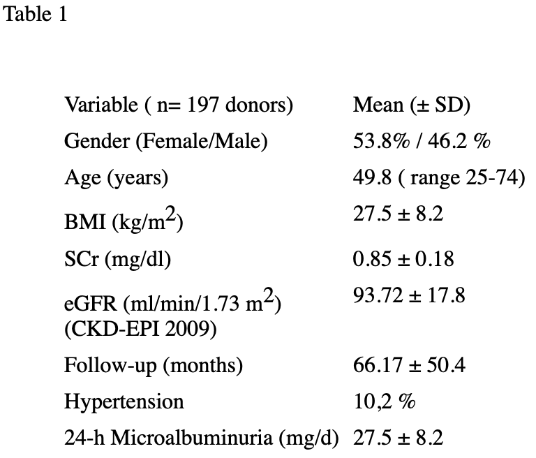 Methods: Our data includes laboratory and clinical data on 197 patients who were donors between 2000-2022. The variables analyzed were: 1) GFR as Scr, eGFR (CKD-EPI 2009) and 24-h CrCl. 2) Proteinuria as 24-h microalbuminuria. 3) Hypertension. 4) Body Mass Index. 5) Renal Functional Reserve (RFR). We correlated post-donation GFR with expected GFR (adjusted to age and single kidney). Pre-donation RFR was correlated with post-donation GFR. Univariate analysis was used to compare pre and post-donation variables.