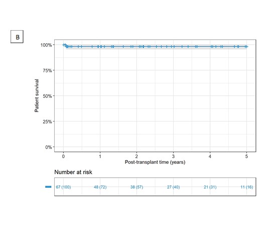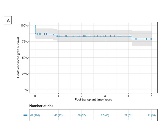 Results: A total of 67 LDKT patients were analyzed. Most patients were male (55.2%). The predominant known chronic kidney disease etiology was congenital (n = 24, 35.8%). There were 14 (20.9%) LDKT patients with a preemptive transplant. Dialysis duration was 9.2 ± 13.9 months. Most of the live kidney donors (LKD) were female (n = 39, 58.2%), and relatives for the recipient (n = 61, 91%). Main clinical outcomes were mortality (n =1, 1.5%) and graft loss (n = 14, 20.9%). The graft survival death-censored rates were 83.2% and 78.8% at 1 and 5 years respectively. Patient survival rates were 98.4% at 1 year and was constant during the follow-up. During the follow-up period, a total of 6 patients had vascular complications (8.9%), 1 had peri transplant hematoma (1.5%), 7 had urinary leak (10.4%), and 17 required reoperations (25.4%).