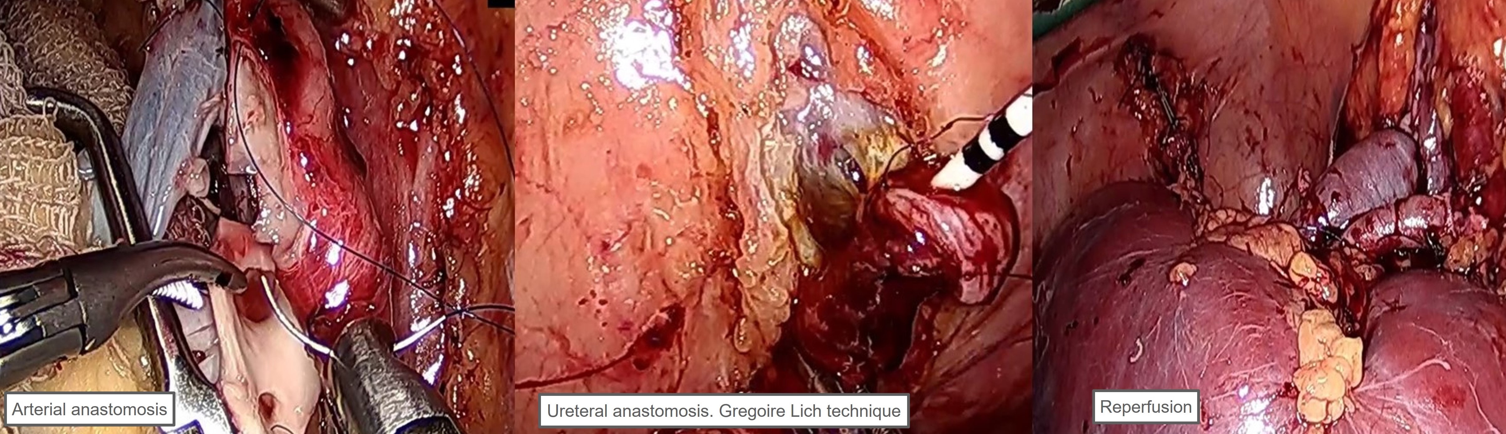 Methods: Donnor: deceased donnor, male , KDPI 5% , cold ischemia time 14 hrs , left kidney, 2 arteries. Recepient: females, 54 yrs old, bmi 27.8 , membranous glomerulopathy , 6 yrs on hemodyalisis. Surgical technique: transperitoneal aproach, the surgical steps are resumed in figure 1. We used modifications of Modi´s technique : diferent incision ( midline instead of pfanestiel aproach), use of ureteral stent, and cold jacket gauze for local hypothermia.