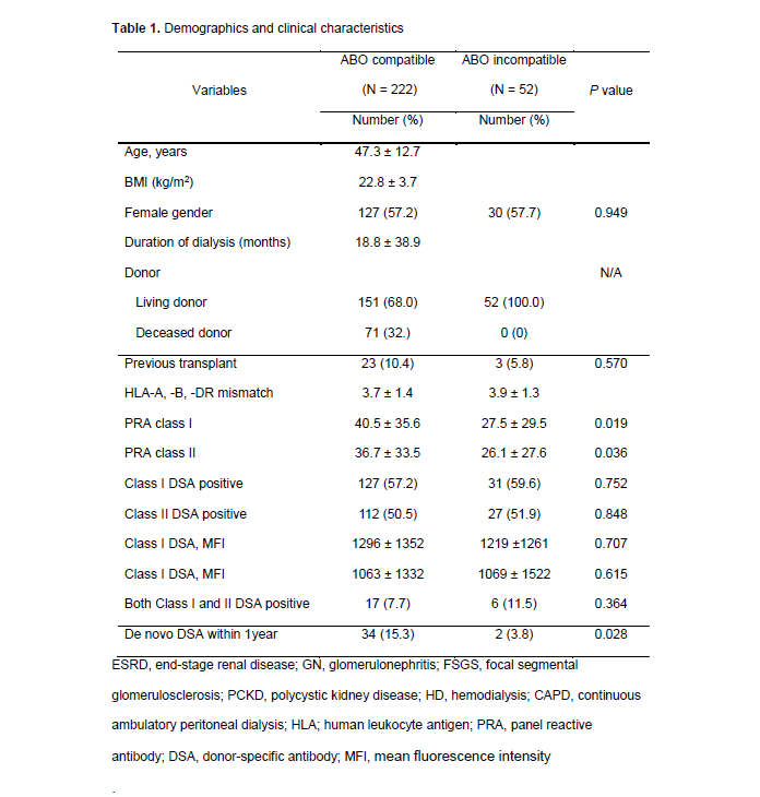 Methods: This retrospective observational study included pre-transplant DSA positive recipients with maximal DSA MFI <5000 and negative flow‐cytometric crossmatching (FCXM) between January 2014 and December 2019. A total of 274 patients were divided into an ABOc(n=222) and an ABOi (n=87) group.