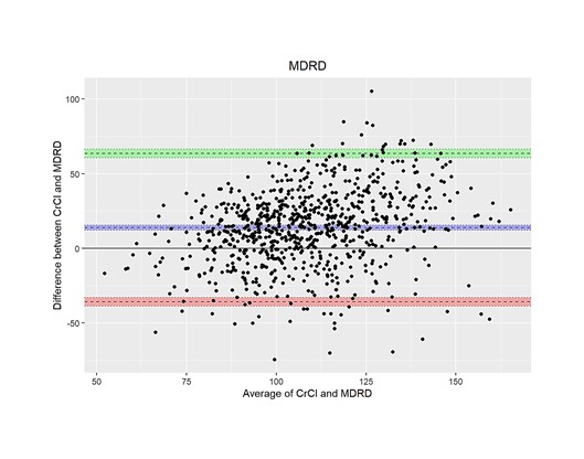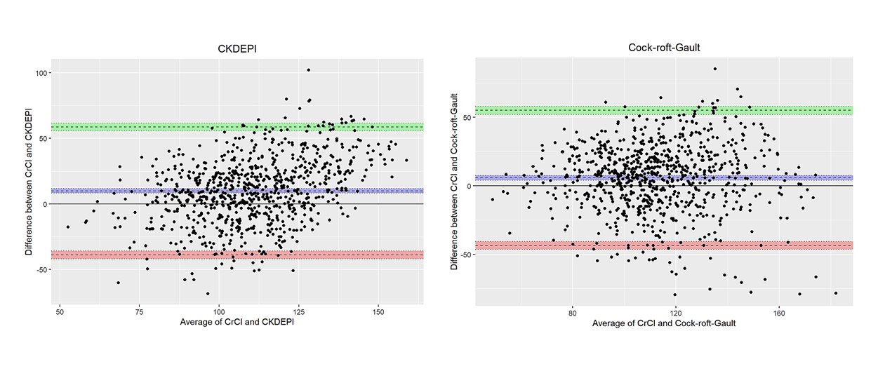Results: Using the Bland Altman graphic, we observed that the most dispersed results are obtained using MDRD. Smallest mean bias and was observed for Cockcroft-Gault (bias of 5.8; SD 25.1) compared to the other equations (CKD-EPI: bias of 9.8; SD 24.8 and MDRD: bias of 13.8; SD 25.3). Smallest bias was found in females for the three equations. Results of mean bias were similar when comparing the three equations in patients with ClCr GFR < 60, however, smaller mean bias were found for the three equations above age 40 years. Regarding the assessment of the 95% limits of agreement (LoA), we found a high dispersion for the three equations being the highest upper limit of agreement 63.5 (MDRD) and the highest lower limit of agreement -43.4 (Cock-roft-Gault).
