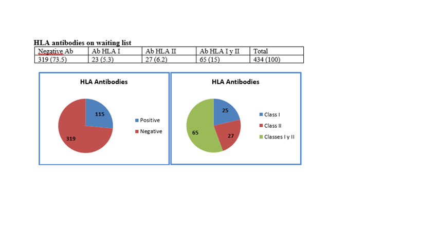 Results: There are currently 434 patients in the WL, including one vascular emergency. Distribution - by age: 1.8% <18 years old, 85% 18-64 years old and 13.2%>65 years old; by sex: 43.8% female, 56.2% male. Blood group distribution: 54% are 0.35% A, 8% B and 2% AB. The highest immunological risk group: 18%, who aspire to be retransplanted, 1.4% hyperimmunized. There are 26.5% with positive HLA antibody screening, see table and distribution in graphs.