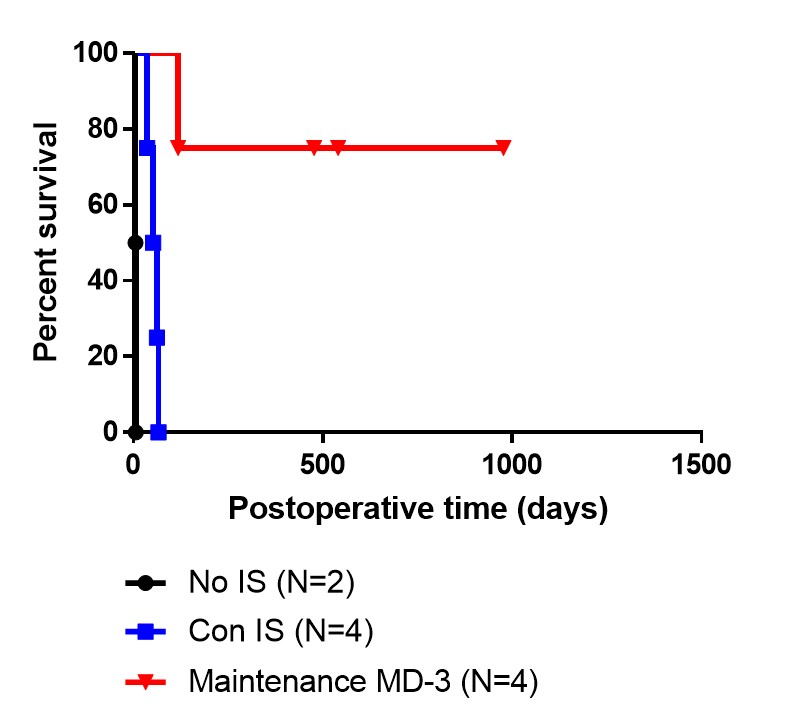 Conclusions: Long-term MD-3 mono-maintenance therapy suppressed liver allograft rejection and kept liver allograft survival without maintenance of conventional immunosuppressants including calcineurin inhibitor. Therefore, MD-3 is a promising as a mono-maintenance therapy without calcineurin inhibitors for liver transplantation, although MD-3 failed to induced liver allograft tolerance as a short-term therapy.