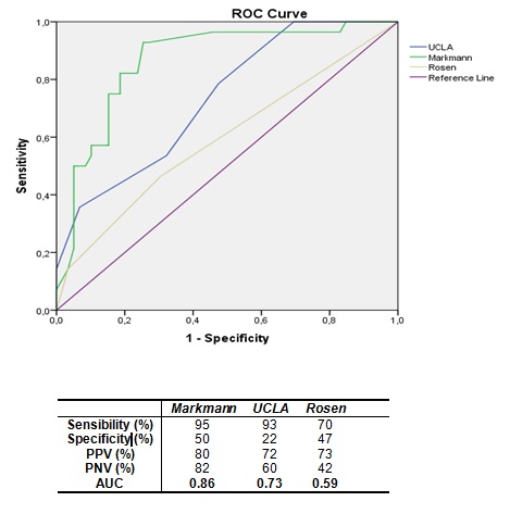 Results: Sixty-nine reTx (6.8%) were done; mean age was 39±17 years; 58% males. Five (8%) were U-reTx, eight (11%) were E-reTx and 56 (81%) were L-reTx. The mean time between primary LTx (p-LTx) and U-reTx and E- reTx was 4±2 and 26±14 days, respectively and 2016±240 days between p-LTx and L-reTx. Main causes for U-reTx were arterial thrombosis (AT) =3 and primary non function (PNF) =2, causes for E-reTx were AT =5 and PNF =3. L-reTx was indicated due to recurrence disease: 15 (HCV 9, HBV 2, and HAI 4), ductopenic rejection=15, biliary complications= 10, Ischemic cholangiopathy = 9, AT=7. Mean donor age was 35±13 year. Two variables were found to be independently associated with poor outcome, recipient age >45 years (odds ratio 4.1, 95% CI 1.5 to 11.4; p=0.006), and cold ischemia time (CIT) >495 minutes (odds ratio 4.4, 95% CI 1.4 to 13.3; p=0.009). Overall, U-reTx, E-reTx and L-reTx graft and patient survivals at 1, 5 and 7 years are shown in figure 1, as well as those with p-LTx. Markmann survival score was the most sensitive and specific in our cohort (Figure 2).
