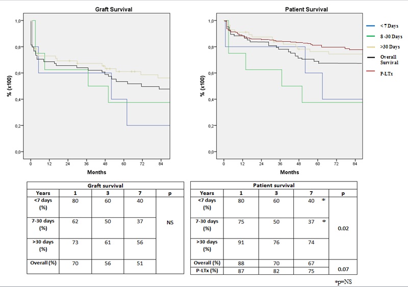 Patients and Methods: From July 1995 to March 2022, 1001 consecutive adult liver transplants were performed at our center. Demographical and clinical variables, second graft survival and survival predictor scores (Rosen modified, UCLA and Markmann) were retrospectively applied and analysed for urgent, early and late reTx (2nd and 3rd reTx were excluded). Urgent reTx (U-reTx) was defined as those done within 7 days, early reTx (E-reTx) between 8 and 30 post-operative days, late re-Tx (L-reTx) those that occur after. Statistics: univariate and multivariate analysis, logistic regression for mortality, using ROC curves. Kaplan Meier and log rank for actuarial survival were performed in SPSS v20.0.