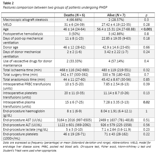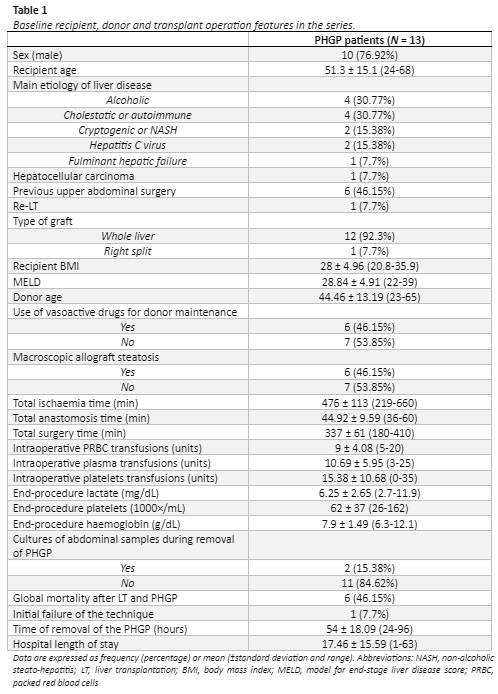 Method: We conducted a retrospective and descriptive study. We reviewed the clinical records of 13 orthotopic liver transplantation (OLT) patients undergoing PHGP between a total of 407 patients at the HPB surgery and liver transplant department of the Hospital de Alta Complejidad “El Cruce” between January 2013 and February 2022. Patients and donor’s demographics and intra/postoperative features were analyzed. Continuous data are presented as medians and means and standard deviations. Discrete data are given as counts and percentages. Chi-square test, Fisher exact test, Mann–Whitney U test and Student's T-test were used when appropriate (for categorical and continuous data respectively). Two-sided p value equal or less than 0.05 was considered to indicate statistical significance with a confidence interval of 95%. All analyses were conducted using MedCalc version 20.027 (https://www.medcalc.org/).