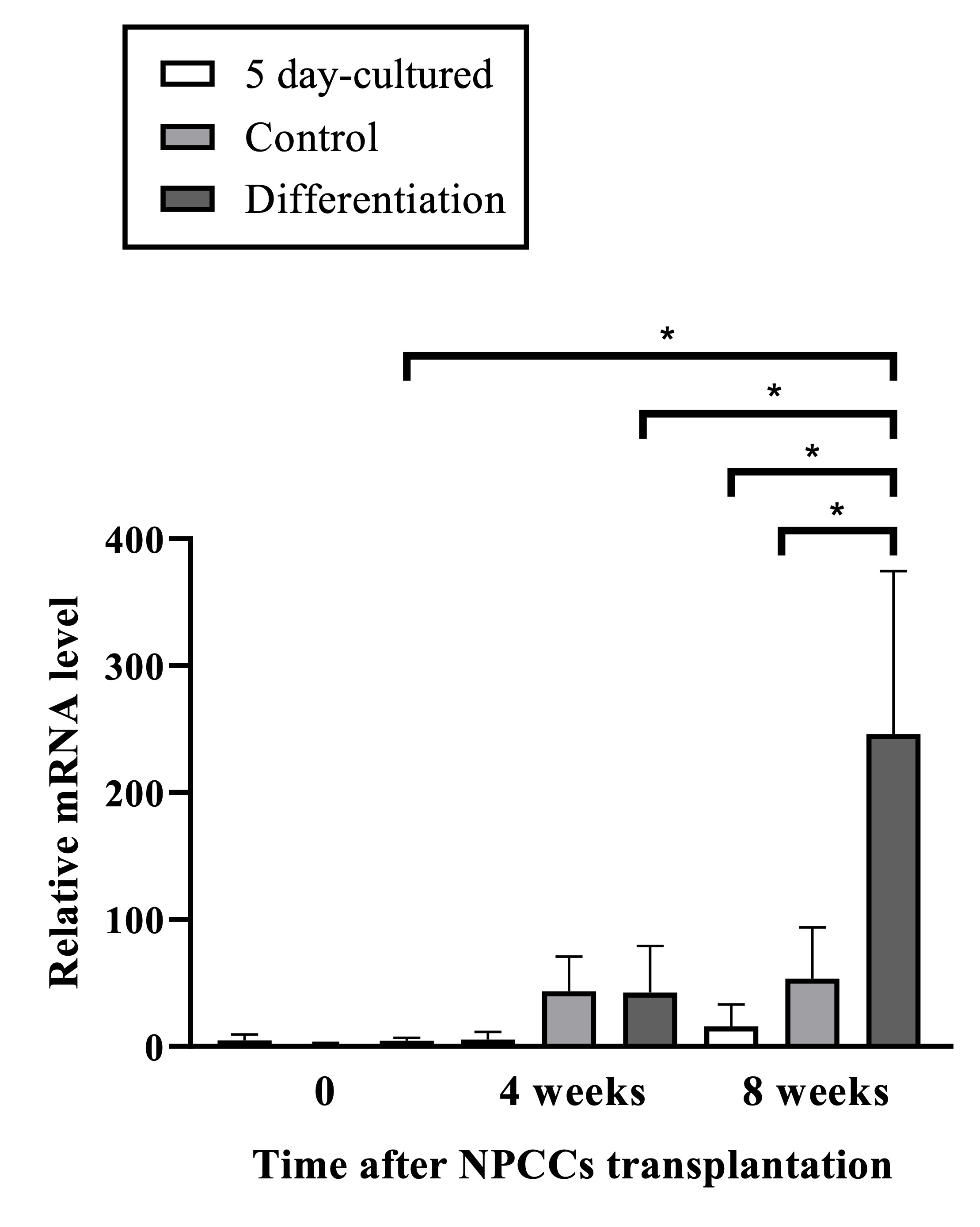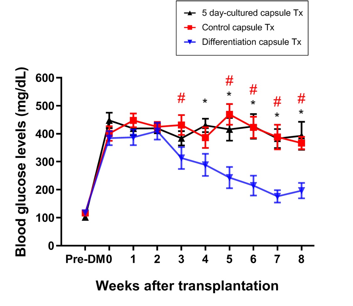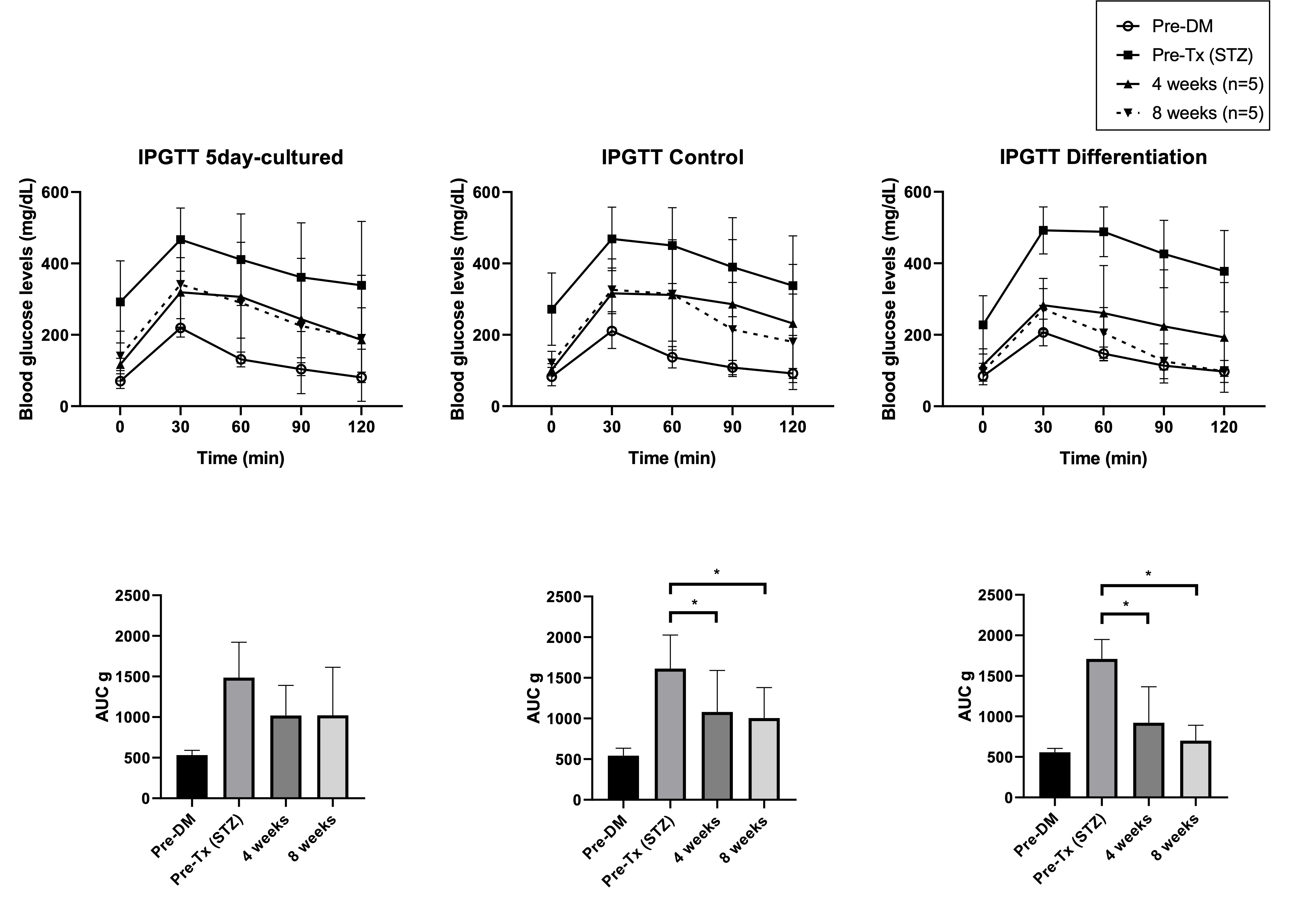 Methods: NPCCs were isolated from 3 days old piglets. NPCCs were cultured for 5 days in Ham’s F-10 media and encapsulated with alginate on day 5. The microencapsulated NPCCs were divided by two groups; control, differentiation. DMEM/F-12 media was used as basal media for control group. For maturation of microencapsulated NPCCs, the media was supplemented with ALK5i, T3 and Exendin-4. Both groups were cultured for 2 weeks. The control and differentiated NPCCs (8,000 IEQ) were transplanted into type 1 diabetic BALB/c mice.