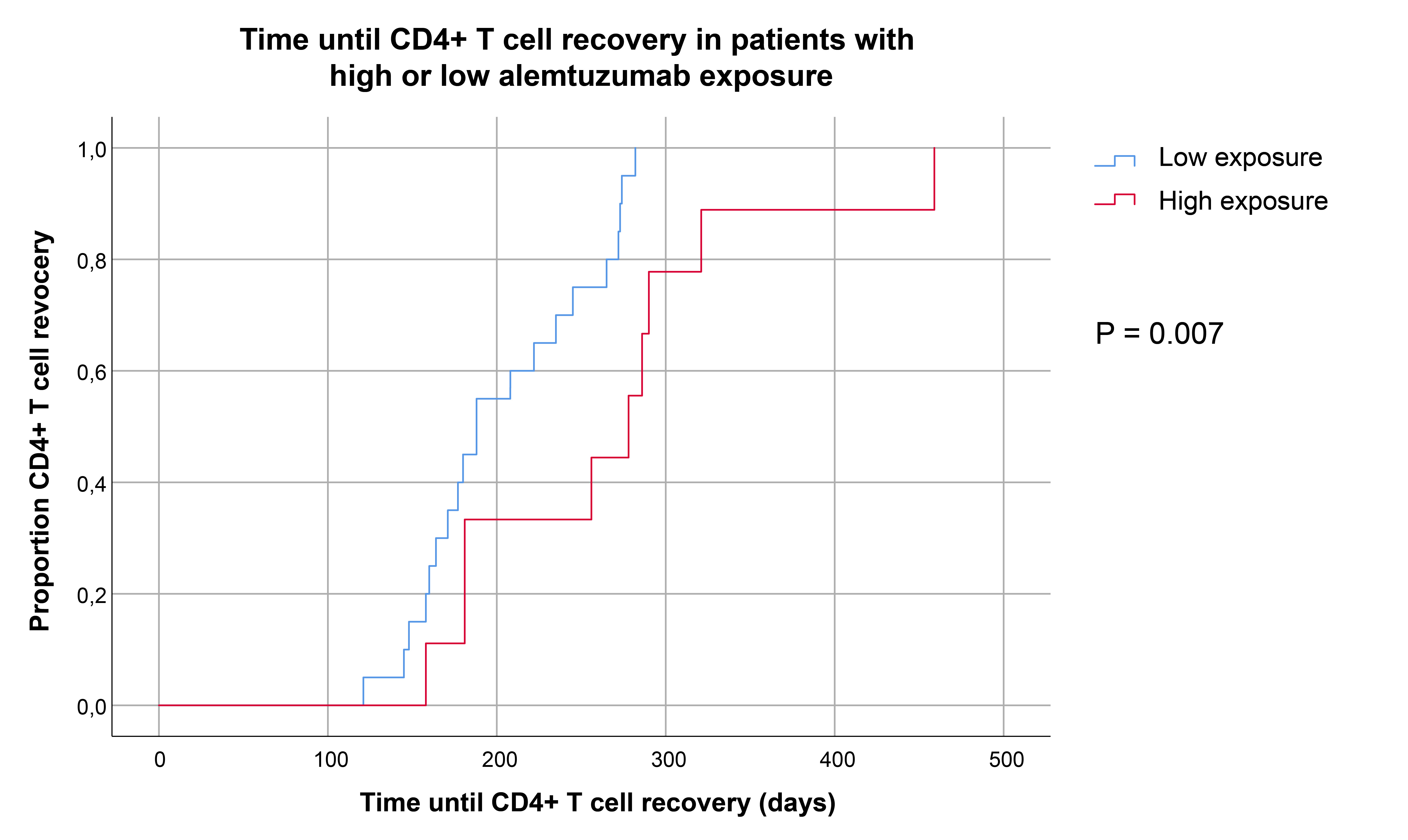 Results: The predicted TATC and Cmax demonstrated considerable interpatient variability ranging from 29.9-64.0 days (median: 39.7) and 0.54 to 1.39 mg/L (median: 0.80) respectively. KTRs with a TATC > 66th percentile (42.4 days) were categorized as ‘high exposure’ and patients below this threshold as ‘low exposure’. Median absolute CD4 T cell numbers at week 6 (118 vs 443, P=0.0096) and week 12 (1519 vs 7762, P=0.003) were lower in KTRs with high exposure than in patients with low exposure. Similar trends were observed for CD8 T cells, regulatory T cells and to a lesser degree for B cells. In order to predict the timepoint that patients reached CD4 T cell recovery more accurately, time to CD4 T cell recovery for every patient was predicted using a basic, empirical nonlinear mixed effects model. Kaplan Meier analysis demonstrated that KTRs with high exposure reached CD4 T cell recovery at later timepoints than patients with lower exposure (Figure 1). Regardless of differences in lymphocyte recovery rate, there was no statistically significant difference in the cumulative incidences of BK-virus, CMV, EBV or de novo donor-specific antibody formation between the two groups.