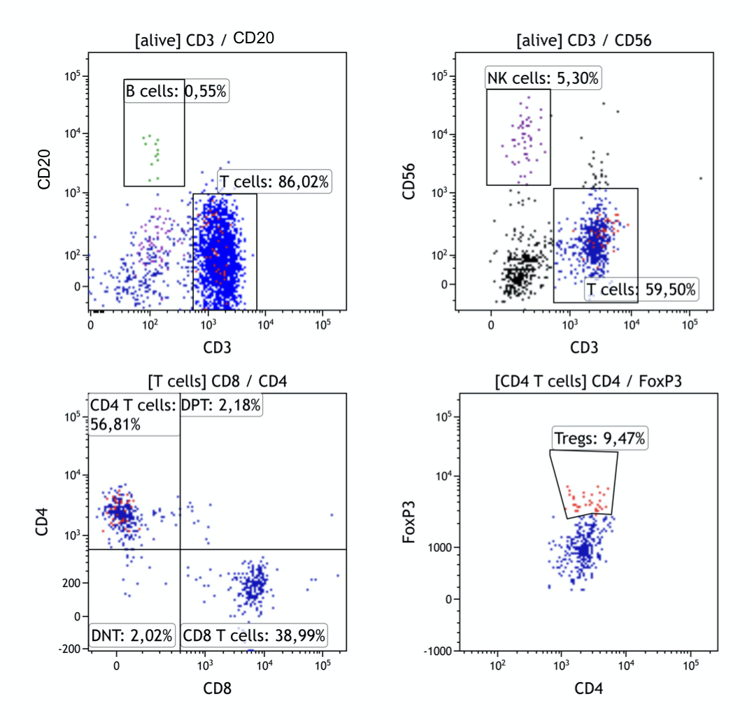 Methods: In the study, we analyzed cells isolated from explanted corneas from patients qualified for corneal transplantation (TX), either first procedure (primary TX, PTX group n=13) or retransplantation (repeated TX, RTX group n=13). The tissue was incubated for 24h in a culture medium at 37oC to allow immune cells to release from the tissue. For comparison, peripheral blood (PB) was acquired. The samples were analyzed by flow cytometry for lineage markers of T, B, and NK cells, T regulatory cells (Tregs), memory phenotype (CD62L, CD45RA), and Helios expression.
