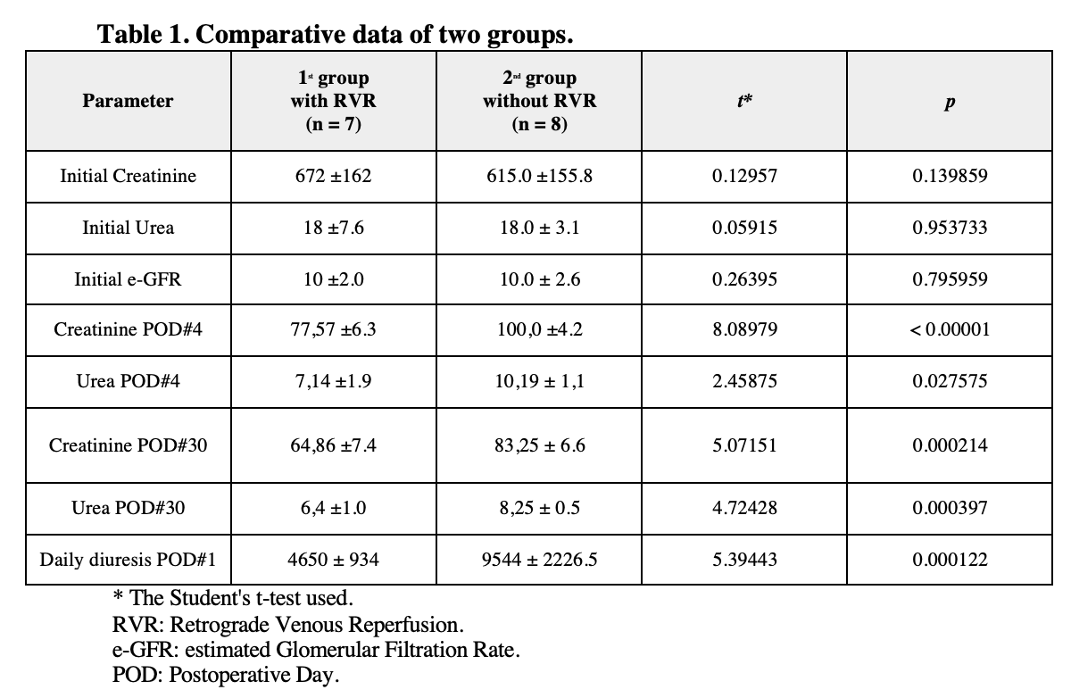 Result: In all cases, the graft function was satisfactory. There were no vascular complications. Significant changes in pH, PO2, BEecf, HCO3−, Lac, K+, and Ca2+values observed in retrograde blood. In the RVR-group daily diuresis in first POD, there was no polyuria, while in the control group there was significant polyuria. Normalization of serum creatinine and urea levels observed on average on the 4th day after surgery (Table 1 and 2).
