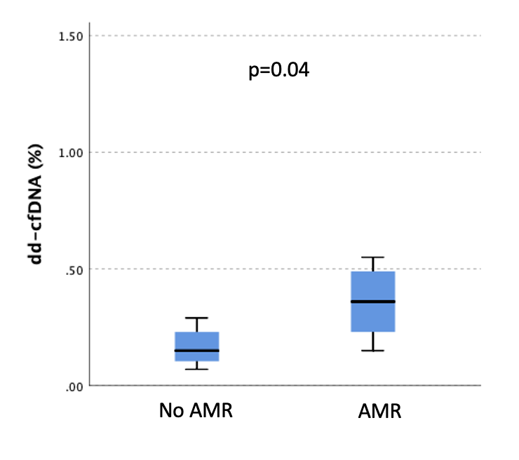 Results: DdcfDNA assessment was performed in 66 recipients. Median ddcfDNA levels were significantly higher during the first month after HT (0.33% [IQR 0.19 to 0.47] in the first 30 days vs. 0.17% [IQR 0.12 to 0.23] after 30 days from HT, p=0.004). Rejection was detected in 19 (28.8%) patients, in whom median ddcfDNA levels were 0.23% (IQR 0.16 to 0.38%). Starting from 30 days after HT, ddcfDNA levels were higher in recipients with AMR (p=0.04, Figure 1) as compared to those without.