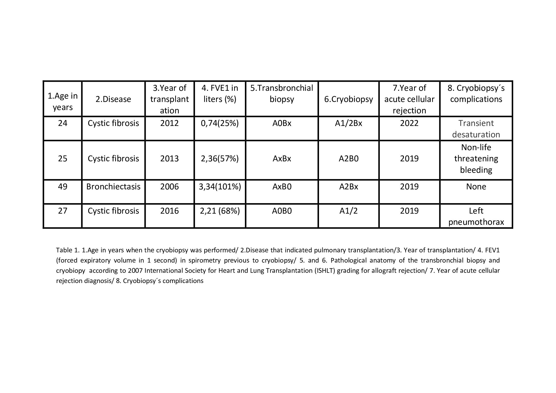 Results: Four pulmonary transplanted patients were submitted to transbronchial biopsy, which either resulted inconclusive (Ax according with ISHLT grading for allograft rejection) or inconsistent with clinical manifestations and pulmonary function. As an outcome, those patients underwent cryobiopsy to investigate allograft dysfunction. All of them had their rejection grading modified after the procedure and therefore their treatment which consisted in pulse therapy with methylprednisolone. The characteristics of the patients are described in Table1.