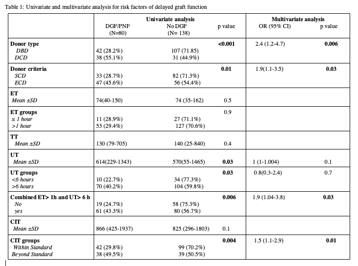 There were 115 (52.8%) KTx from SCD, of whom with a BS CIT were 40/115 (34.8%). Overall in the SCD group DGF/PNF was observed in 33/115 (28.7%) patients. The incidence of DGF/PNF is SCD KTx with a BS CIT was 16/40 (40%) compared with 17/75 (22.7%) in those SCD transplanted Within Standard (WS) CIT (P=0.04). The major component of CIT was UT representing 65%±18% of the CIT. Univariate and multivariate analysis of risk factors of DGF is illustrated in table 1.