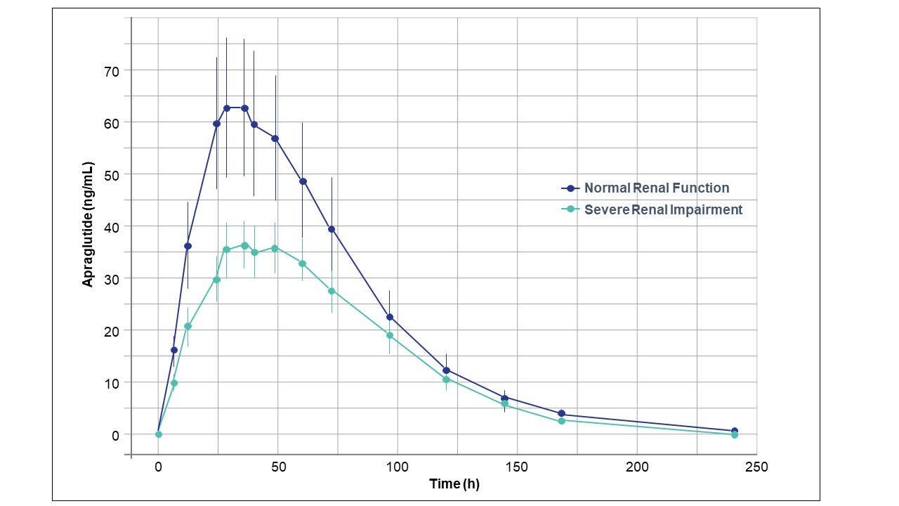 Conclusion: Exposure to apraglutide in subjects with severe renal impairment is not increased compared to healthy subjects. A single dose of 5-mg apraglutide in subjects with severe renal disease and healthy matched subjects was well-tolerated, and no unexpected safety issues were raised. The study results are clinically significant as 28% of patients with SBS-IF have renal impairment (Wang P et al. 2021) and may not be candidates for treatment with currently available GLP-2, which requires dose adjustment. By contrast, apraglutide dose adjustments are not necessary for subjects with renal impairment.