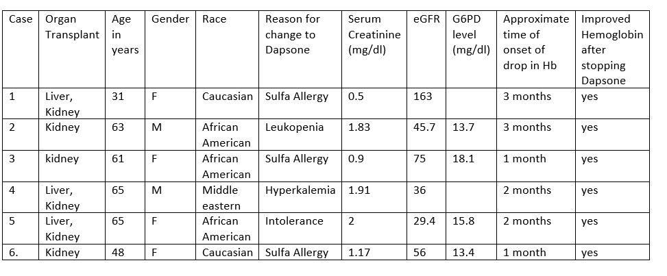 Methods: We identified 6 organ transplant recipients with normal G6PD activity who developed anemia after initiation of Dapsone for PJP prophylaxis. Anemia workup include iron studies, vitamin B12, folate, reticulocyte count, haptoglobin, LDH, gastrointestinal, and other anatomic blood loss.