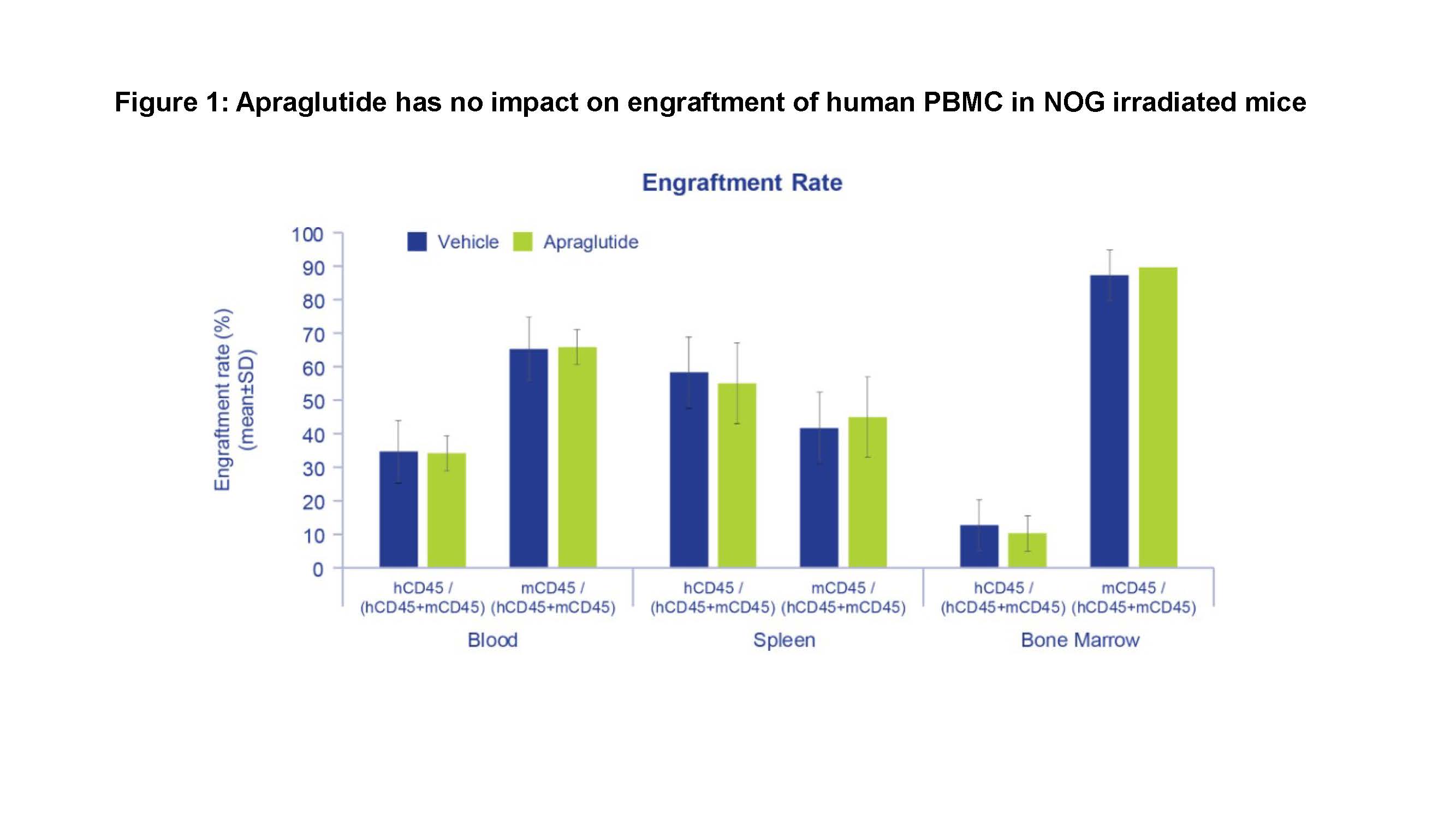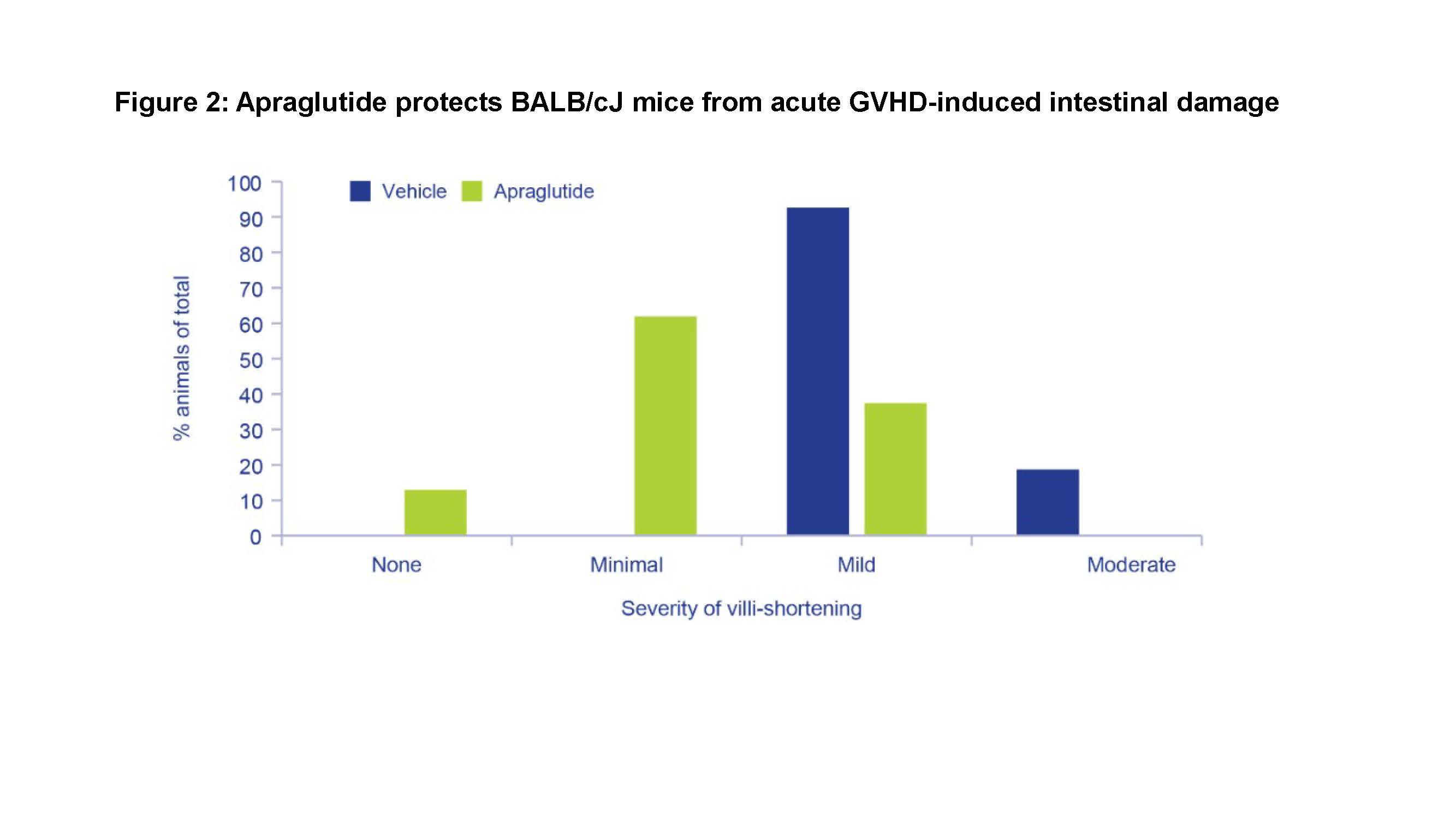 Methods: In Study 1, total-body-irradiated (TBI) immunodeficient (NOG) mice (Day 0) were injected with human peripheral blood mononuclear cell (hPBMC; 3x107; Day 2) and treated with apraglutide 3.3 mg/kg or vehicle (Days -6 to 18). Engraftment rate was determined through CD45 expression (human vs. mouse) in blood, bone marrow, and spleen. In Study 2, TBI-induced intestinal damaged BALB/cJ mice received allogeneic transplantation from C57BL/6 strain and were treated with apraglutide (3.3 mg/kg) or vehicle (Days -9, -7, -5, -3 -1, +1, +3, +5, +7). Intestinal damage indicative of GvHD (histological changes, length, hemorrhage, inflammation), body weight, and survival were assessed.