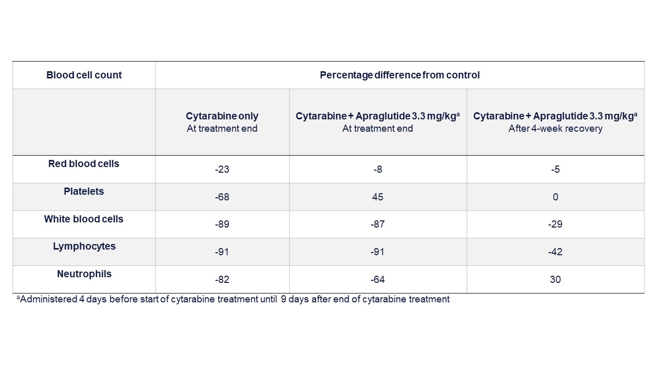 Methods: Study 1 assessed cytarabine’s antitumor effects in leukemic NOD/SCID mice. Apraglutide or vehicle was administered on Days -4 to 4. Cytarabine or vehicle was administered on Days 0-4. Bone marrow and spleen samples were collected on Day 7, and the percentage of hCD45+ cells was determined. Study 2 assessed the effect of apraglutide on cytarabine-induced immunosuppression and included three groups of Balb/c mice: (A) vehicle; (B) cytarabine on Days 5-9; (C) cytarabine on Days 5-9, concomitant apraglutide on Days 5-18. RBC, platelets, WBC, NEU, and LYMPH, were assessed. A cohort was allowed to survive for four weeks to evaluate the effect of apraglutide on immunosuppression recovery. Study 3 assessed the effect of apraglutide on melphalan-induced immunosuppression. Three groups of Balb/c mice were included: (A) vehicle; (B) melphalan on Day 9; (C) melphalan on Day 9, apraglutide pre-treatment on Days 1, 3, 5, 7 and continued as co-administration on Days 9, 11, and 13. WBC, NEU, and LYMPH were assessed.