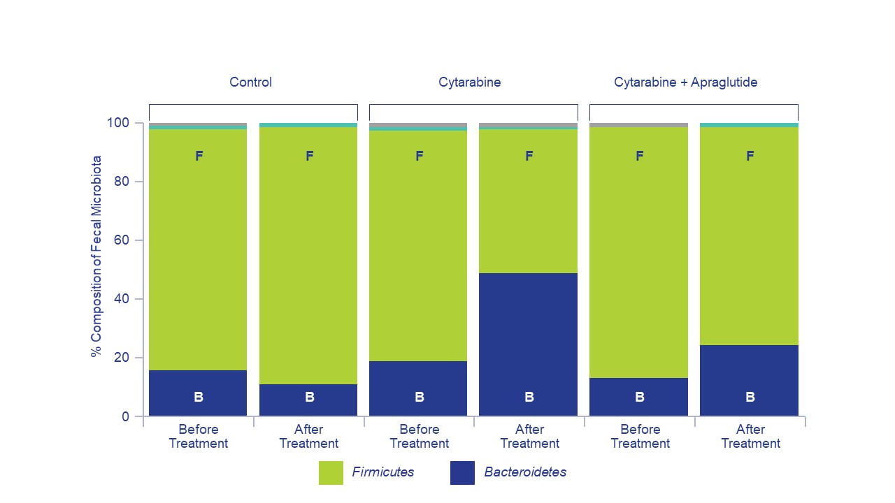 Results: Bacteroidetes and Firmicutes were the two leading bacterial phyla identified. Chemotherapy with cytarabine caused significant changes in the composition of bacterial species, increasing the Bacteroidetes population and decreasing the proportion of Firmicutes bacteria. The change in Bacteroidetes and Firmicutes bacteria levels from Days 0 to 18 was significantly greater in the cytarabine-only and cytarabine + apraglutide mice vs. vehicle. However, this effect was reduced by apraglutide co-administration. The difference in the change between cytarabine-only and cytarabine + apraglutide groups reached statistical significance for both Bacteroidetes (0.2486; p<0.0001) and Firmicutes (0.2037; p<0.0001). In addition, the ratio of Bacteroidetes to Firmicutes bacteria present remained more constant in cytarabine + apraglutide than in the cytarabine-only group.