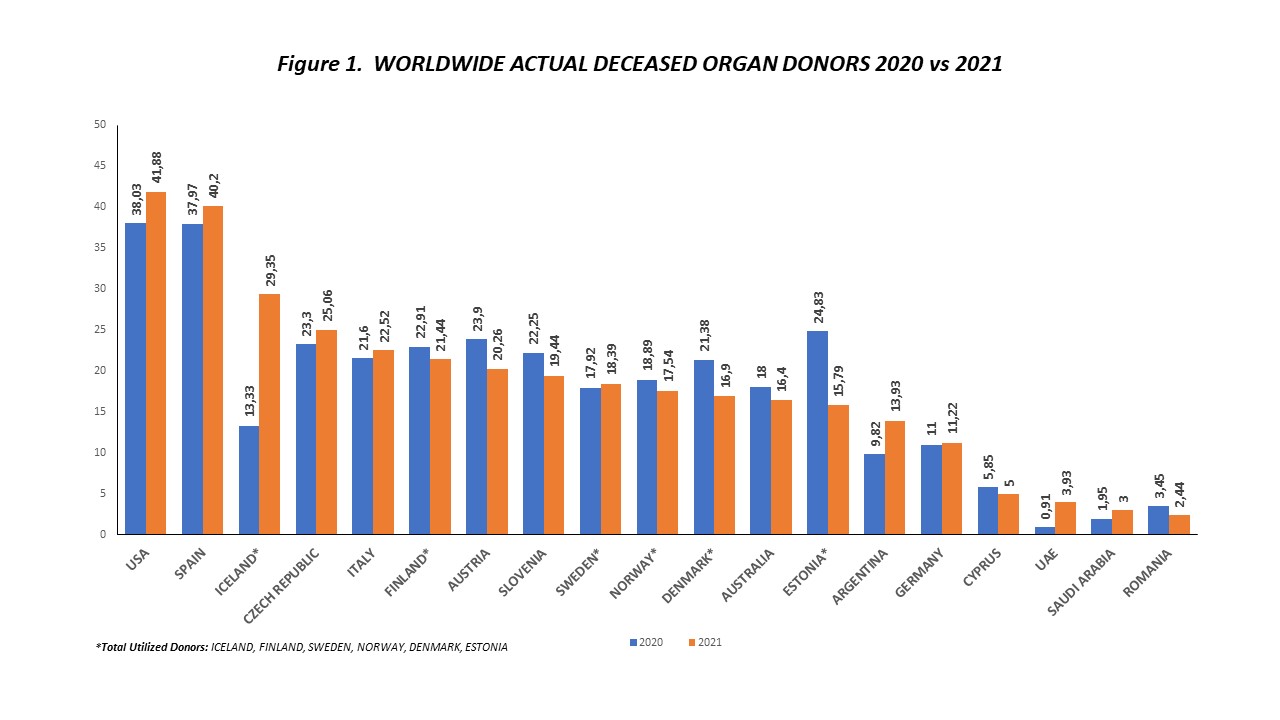 Results: Currently twenty one countries have summited the database from 2021 at the IRODaT registry. Although organ D&T rates mostly dropped as expected due to the emergency of COVID-19 worldwide, some countries had the highest improvement in deceased donation (DD) compared to 2020 data, such as: Spain (from 37,97 to 40,2 pmp), USA (from 38,03 to 41,88 pmp), Italy (from 21,6 to 22,52 pmp); Czech Republic (from 23,3 to 25,06 pmp), Argentina (from 9,82 to 13,13 pmp) and Iceland (from 13,33 to 29,35 pmp); while Australia, Austria, Denmark and Estonia reported a downward trend with16 from 18 pmp; 20,26 from 23,9 pmp;16,90 from 21,38 pmp and 15,79 from 24,83 pmp and respectively. The increase in the DD activity of Saudi Arabia and United Arab Emirates is significant by 150% and 400% compared to the previous year. Regarding Brazil and Portugal preliminary data, the numbers collected included only the first semester of 2021 and are excluded in the figure 1.