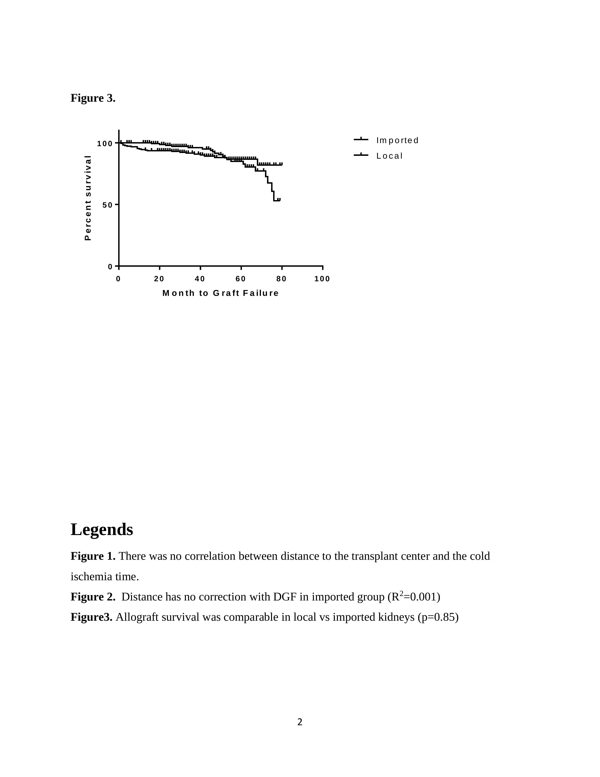 Results: Donor and recipient demographics were similar in both groups. Induction and maintenance immunosuppression were similar in both groups. CIT was significantly higher in the imported group (27.6 vs. 15.9 hours, p< 0.0001). However, distance did not impact CIT significantly (R2= 0.07) in the imported KT’s. Distance also did not impact the rate of DGF in both groups (imported 21% vs. 22%, p=0.74). Patient and graft survivals were similar in the imported vs. local group.
