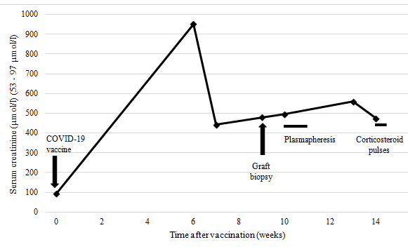 In this paper, we present a newly developed acute humoral and cellular rejection with acute allograft failure and need of haemodialysis 14 days after administration of the adenovirus vectored SARS-CoV-2 vaccine (AstraZeneca; CHADOx1, AZD1222). This occurred in a patient who previously had an asymptomatic COVID-19 infection.