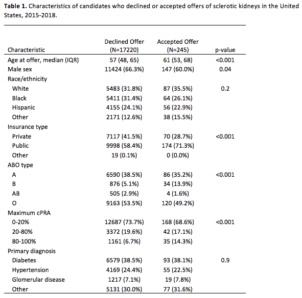 Methods: Using national registry data from the United States (SRTR), we identified all offers from deceased donors with at least 20% glomerulosclerosis of both kidneys, 2015-2018. We compared demographic and clinical characteristics of sclerotic kidney recipients to waitlist candidates who declined the offers. Patients were followed from the time of offer until death or administrative censoring on March 31, 2021. An odds-weighted Cox proportional hazards mode including candidate age, sex, race, education, insurance type, BMI, primary diagnosis, time on dialysis, calculated panel reactive antibody (cPRA), ABO type, previous malignancy, previous transplant, serum albumin, and peripheral vascular disease was used to compare mortality between the two groups.