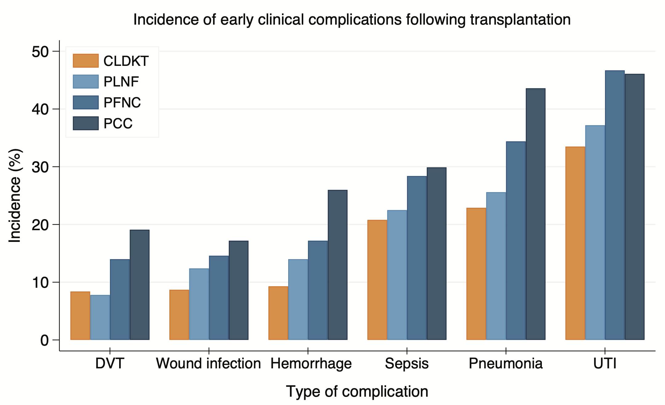 Results: Compared to CLDKT recipients, ILDKT recipients had higher incidence of DVT (14.4% vs. 8.4%), wound infection (15.0% vs. 8.7%), hemorrhage (19.2% vs. 9.3%), sepsis (27.7% vs 20.8%), pneumonia (35.5% vs. 22.9%), and UTI (44.7% vs. 33.5%) (p for all comparisons<0.001) (Figure). Within the first three months, a higher risk of DVT (wHR PLNF=0.050.453.93; PFNC=0.941.793.39; PCC=1.001.883.52), wound infection (wHR PLNF=0.691.232.19; PFNC=1.241.602.06; PCC=0.801.693.62), and hemorrhage (PLNF=1.111.963.47; PFNC=0.911.823.65; PCC=2.072.964.21) were observed across varying levels of DSA strength; however, the risk of these complications decreased thereafter. Although there was no evidence of increased risk of sepsis with the first three months, this risk subsequently increased (PLNF=0.811.874.28; PFNC=0.991.502.30; PCC=1.102.314.81). In contrast, there was higher risk of pneumonia that persisted throughout both time periods (0-3 months wHR PLNF=0.851.914.29; PFNC=1.142.073.75; PCC=1.342.735.59; >3 months wHR PLNF=1.241.571.99; PFNC=0.811.422.49; PCC=1.051.913.48).