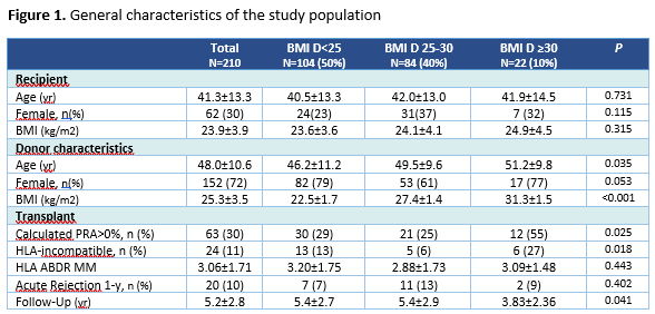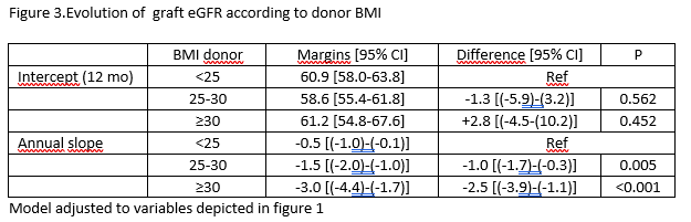 Methods: This is a unicenter retrospective observational study that included LKT between 2008 and 2017. Several clinical data were analyzed as depicted in table1, including the number of acute rejections at the first year, and the graft glomerular filtration rate (eGFR) during the follow-up time (CKD-EPI equation). We grouped donors based on their calculated BMI as follows: <25, 25–30, ≥ 30 kg/m2. The Kaplan-Meier curves and Cox proportional hazards regression were used for survival analysis and linear mixed regression was used to evaluate the slope of recipient eGFR over time, according to BMI groups.