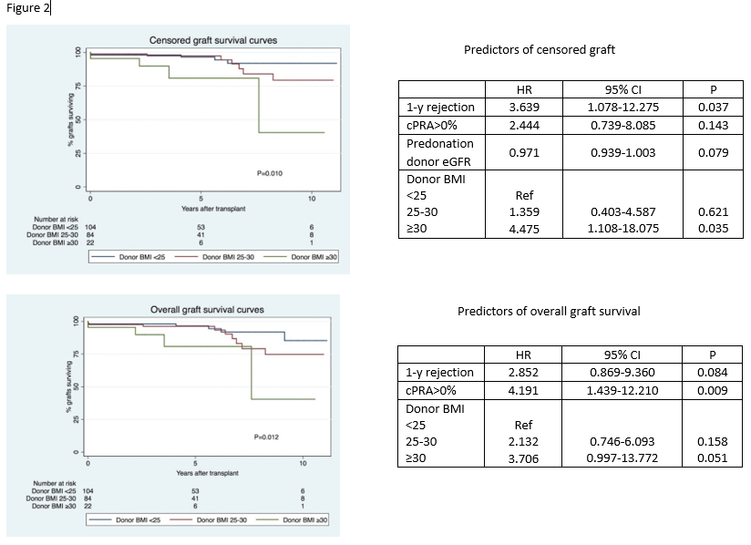 Results: We observed 210 LKT. Mean follow up time was 5.2±2.8years. The mean age of recipients and donors was 41.3±13.3 and 48.0±10.6, respectively. Thirty percent of recipients and 72% of donors were female. Donors had a mean BMI of 25.3±3.5kg/m2. The mean eGFR among donors was 100.1ml/min/1.73m2(SD14.2) at the time of donation. Table 1 shows immunological features of the transplant. Censored graft survival rate at 8-years after transplantation was 92%, 84%, and 40% in recipients from donors BMI <25, 25-30 and ≥30, respectively. Overall graft survival at 8-years after KT was 92%, 79%, and 40% in BMI <25, 25-30 and ≥30, respectively (figure2)). BMI ≥30 (OR= 4,475; p=,035 vs BMI <25) was an independent predictor of censored graft survival in a multivariate analysis, besides acute rejection at 1-y (OR=3,639; p=,037), although none was statistical significant when global graft survival was considered. Comparing with donor BMI <25 kg/m2, a higher donor BMI was associated with a steeper annual decline in eGFR slope after one year after transplantation which difference were -1.0 [95% CI (-1.7)-(-0.3), p=,005] and -2.5 [(-3.9)-(-1.1), p<0.001], among donors with a BMI 25-30 and ≥30 kg/m2, respectively, compared to not overweight donors.