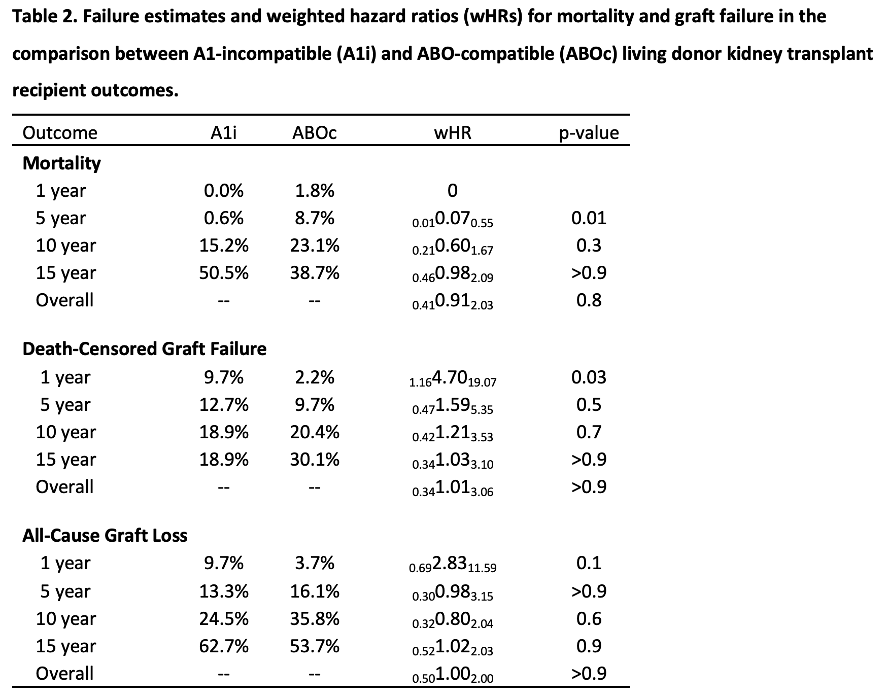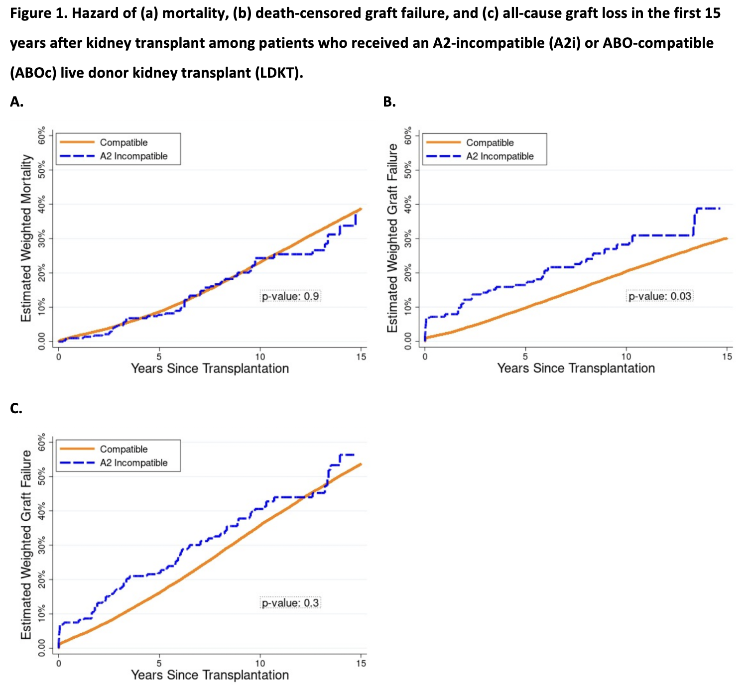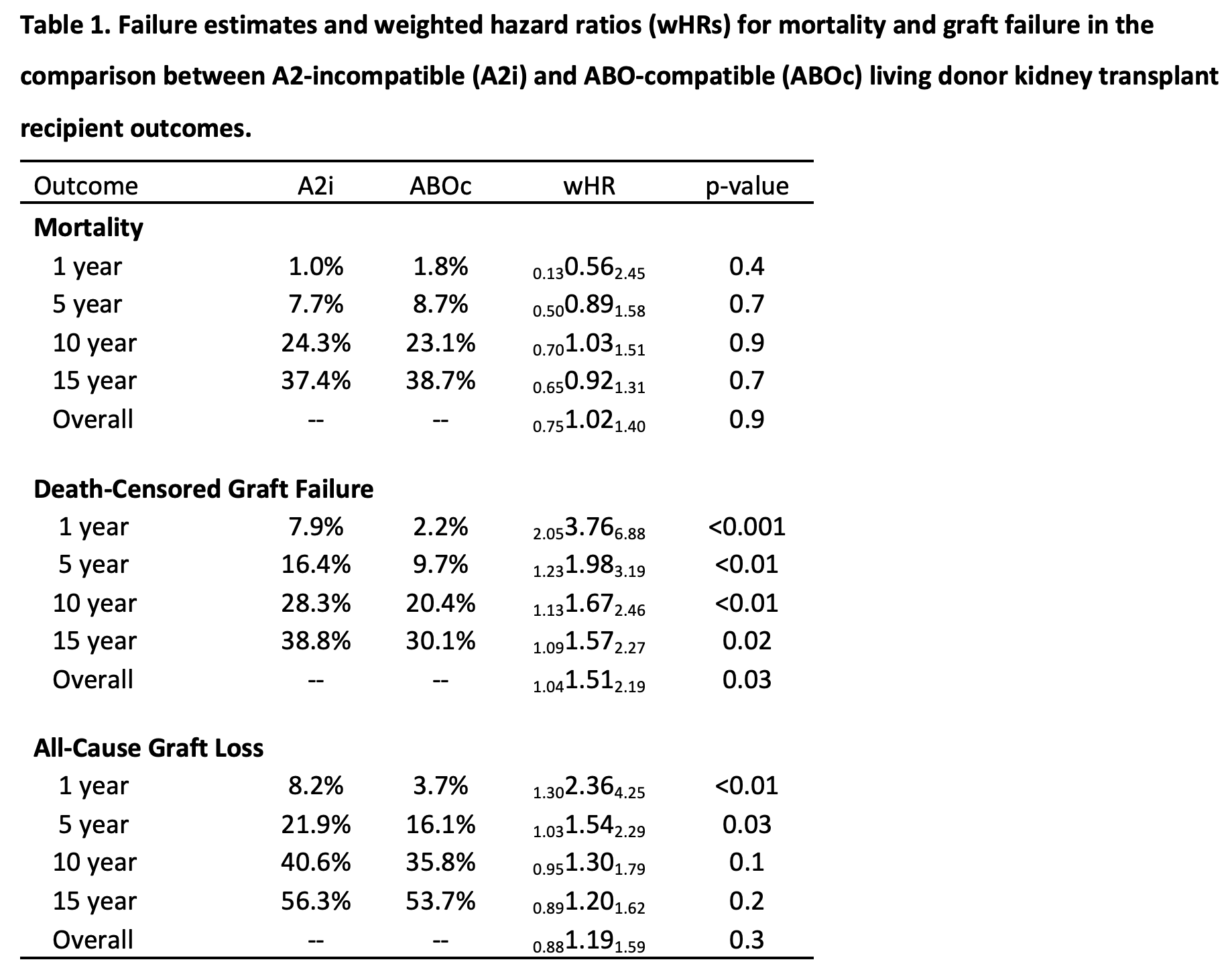 Methods: We used inverse probability weighted Cox regression to compare mortality, death-censored graft failure, and all-cause graft loss in A2i vs. ABO-compatible (ABOc) recipients. These methods were repeated to compare mortality, death-censored graft failure, and all-cause graft loss between A1i vs. comparable ABOc LDKT recipients.