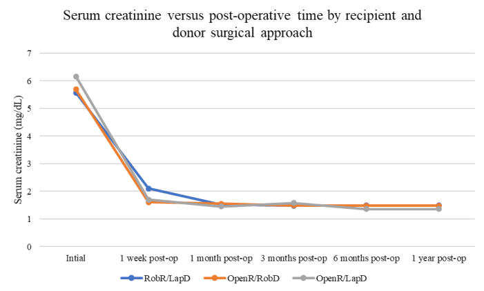 Methods: Institutional records of living donor kidney transplants from 2019 through 2022 were reviewed. Patients were included if their donor surgery was completed through a minimally invasive approach (either laparoscopic or robotic). Patients were classified into three groups based on recipient and donor surgery type: robotic recipient/laparoscopic donor (RobR/LapD); open recipient/robotic donor (OpenR/RobD); open recipient/laparoscopic donor (OpenR/LapD). Records were reviewed for serum creatinine preoperatively and at 1 week, 1 month, 3 months, 6 months and 1 year post-operatively. Patient demographics as well as number of deaths, graft losses, and readmissions within 30 days after surgery were likewise collected. Descriptive statistics were performed; continuous variables were compared with ANOVA; categorical variables were compared with Chi-squared.