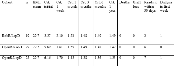 Results: There were 290 renal transplants performed in the selected years. Of these, 76 patients met criteria for inclusion: 46 male and 30 female. The mean age was 54 years (24 – 78); mean BMI was 29.6 (17.7 – 41.6). There was no significant age, sex, or BMI difference between the cohorts (F=0.085, p=0.91; χ2=2.81, p=0.245). There was no significant difference between 1 week, 1 month, 3-month, 6-month or 1 year follow up creatinine levels between the groups (F=0.128, p=0.88). No deaths or incidences of graft loss occurred. One patient in the RobR/LapD group and one patient in the OpenR/LapD group required dialysis within the first week after transplant. There was no significant difference between rates of readmission within 30 days (χ2=1.52, p=0.467).