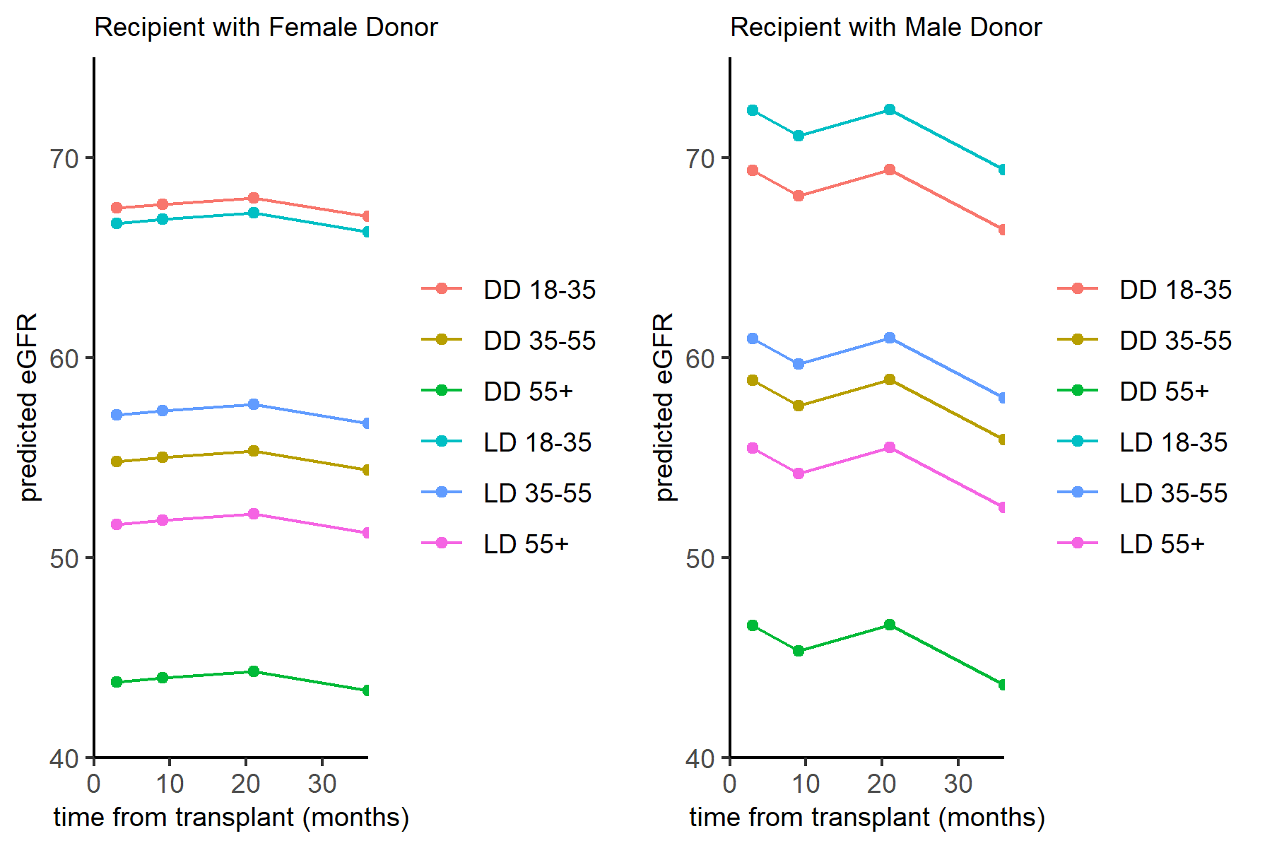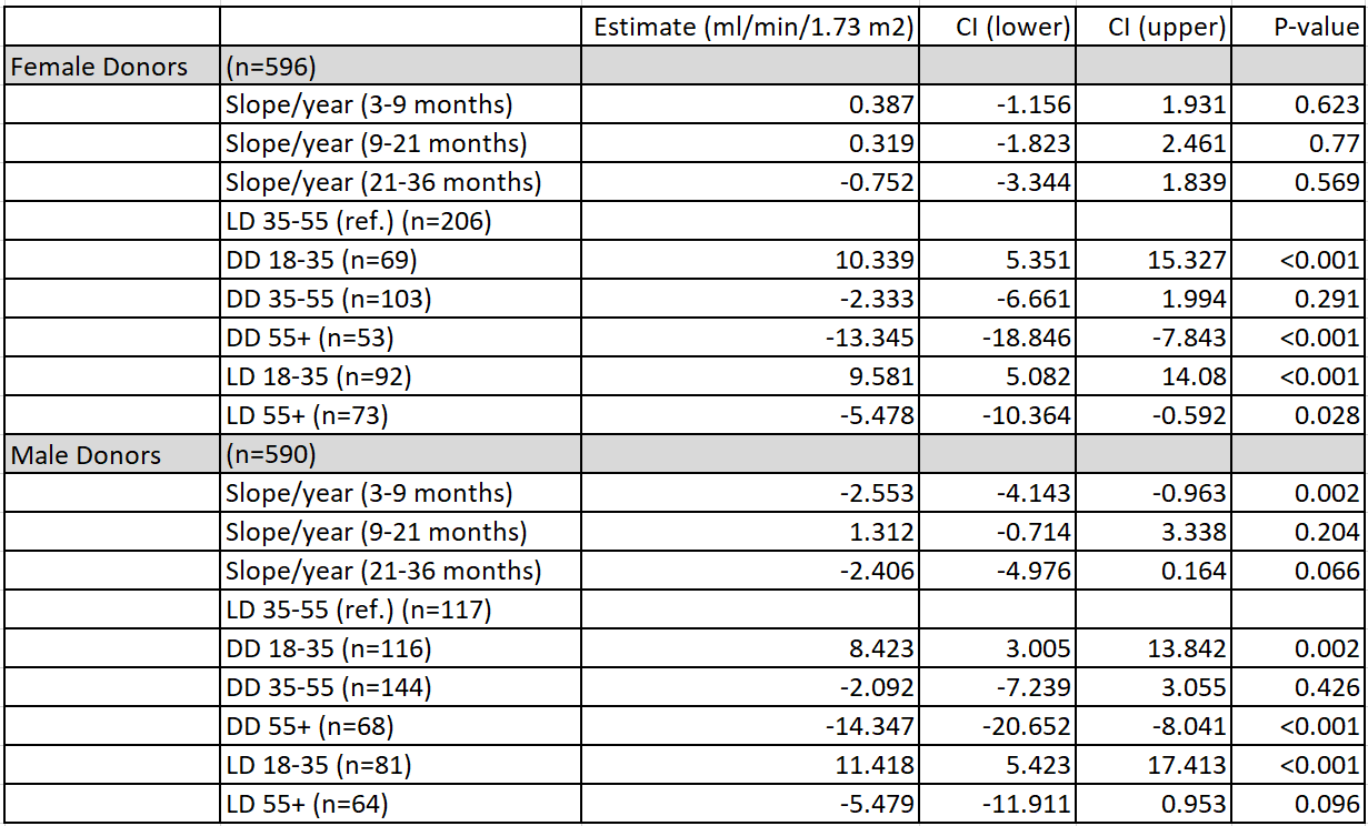 Methods: The medical records of primary LD and DD adult kidney alone recipients at a single center performed between 1/1/10-6/30/21 were analyzed. 62,371 eGFR calculations (CKD-EPI) were available between 3-36 months post-transplant for 1186 recipients. Restricted cubic splines were used to analyze the trajectory of eGFR from 3-36 months post-transplant recipients of kidneys from donors 18-35, 35-55 and >55 years. Slopes were constructed separately from 3-9, 9-21 and 21-36 months. A mixed effects model was utilized to calculate predicted eGFR for donor type/age group, separately for male and female donors (21 additional recipients excluded due to lack of donor gender data). An analysis adjusting for BSA was completed with similar results. Model results are presented in Table 1. All analyses were performed in R, ver. 4.1.1.