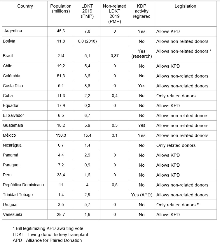 Conclusion: Kidney transplantation, especially from living donors, is the best and less expensive treatment for end-stage kidney disease. Active KPD programs are scarce in the Stalyc countries. Despite housing 8% of the world's population and being composed mainly of low-to-middle income countries, in Latin America and the Caribbean patients still do not benefit from KPD and, consequently, from its full potential for LDKT.