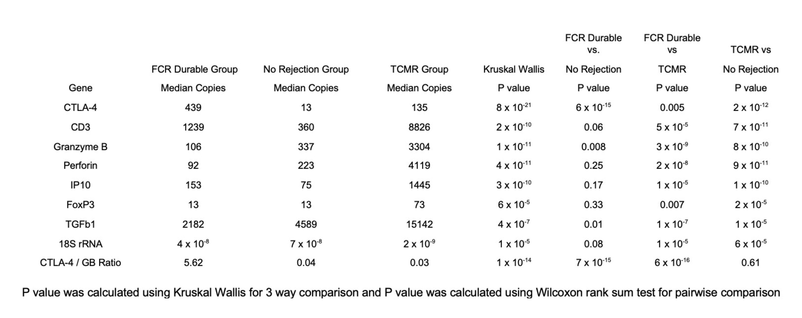 Results: Urinary cell mRNA profile of the FCR Durable Cohort was unique and discriminated the tolerant patients from the patients with TCMR biopsies and the patients with No Rejection biopsies. Absolute levels of urinary cell mRNAs, summarized in Table 1, show that the median level of CTLA-4 mRNA is significantly higher in the FCR Durable Cohort (median 439 copies per microgram of RNA) than in the TCMR cohort (135 copies) or the No Rejection Cohort (13 copies) (Kruskal Wallis [KW] P= 8x10-21). In contrast, urinary cell level of mRNA encoding cytotoxic attack molecule granzyme B was significantly lower in the FCR Durable Cohort (median 106 copies) than in the TCMR cohort (3304 copies) or the No Rejection Cohort (337 copies) (KW P= 1x10-11). The differential gene expression pattern resulted in the ratio of CTLA-4 mRNA to granzyme B mRNA to be significantly higher in the FCR Durable Cohort (5.62) than in the TCMR Cohort (0.03) or the No Rejection Cohort (0.04) (KW P= 1x10-14). Urinary cell levels of mRNA for CD3E, perforin, IP-10, FoxP3, and TGFB1 in the FCR Durable Cohort were significantly lower in the TCMR Cohort and mostly like the profile in the No Rejection Cohort. Comparison to an FCR Transient Cohort (11 biopsy-matched urines from 3 patients conditioned with the FCR001 regimen but with transient chimerism and on immunosuppression) revealed a higher ratio of CTLA-4 mRNA to granzyme B mRNA in the FCR Durable Cohort compared to the FCR Transient Cohort (5.62 vs. 1.99,P=0.21).