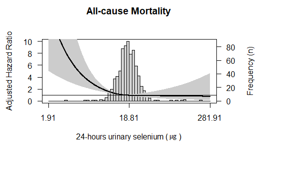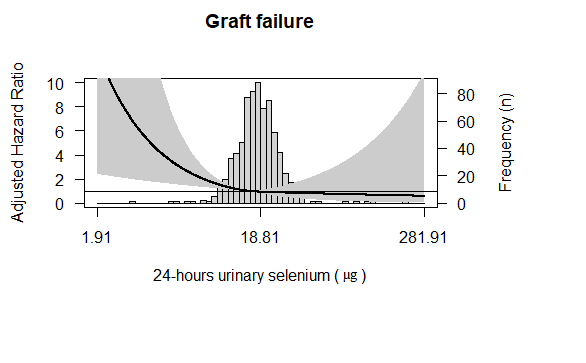 Methods: In this prospective cohort study, all adults KTR with a functioning graft for ≥1-year, without a history of addiction or malignancy, who visited the outpatient clinic of the University Medical Center of Groningen (The Netherlands) between November 2008–May 2011 were invited to participate. Twenty-four-hour urinary Se was chosen as the measurement for Se status since it is considered a trustful indicator of effective Se intake. All participants were asked to collect a 24-hour urine sample during the day before to their visit to the outpatient clinic and urinary Se was measured using inductively-coupled plasma mass spectrometry. The primary endpoints of the current study were all-cause mortality and graft failure. No participants were lost to follow-up. The association between urinary Se and outcomes was tested by means of Cox-proportional hazards regression analyses and restricted cubic splines for graphic purposes. For analyses IBM SPSS software and R Studio were used.