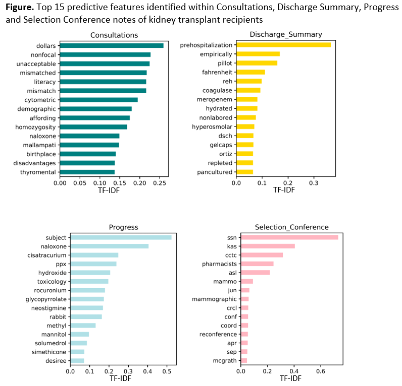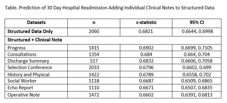 Results: Among 2,060 kidney transplant recipients, 30.7% were readmitted within 30 days. The mean age was 51 years and 47% were Black or African American. TF-IDF identified words that most frequently appear in one clinical note but least frequently in all other documents (Figure). Predictive models had similar performance when considering structured data from the EMR only (c-statistic 0.6821; 95% CI 0.6644, 0.6998) and combined structured + progress notes (c-statistic: 0.6902; 95% CI 0.6699, 0.7105). Predictive models built with clinical notes alone performed worse than models using structured data. Notes that improved model performance the most were more heavily clinical, including progress notes, consultation notes, and discharge summaries (Table).