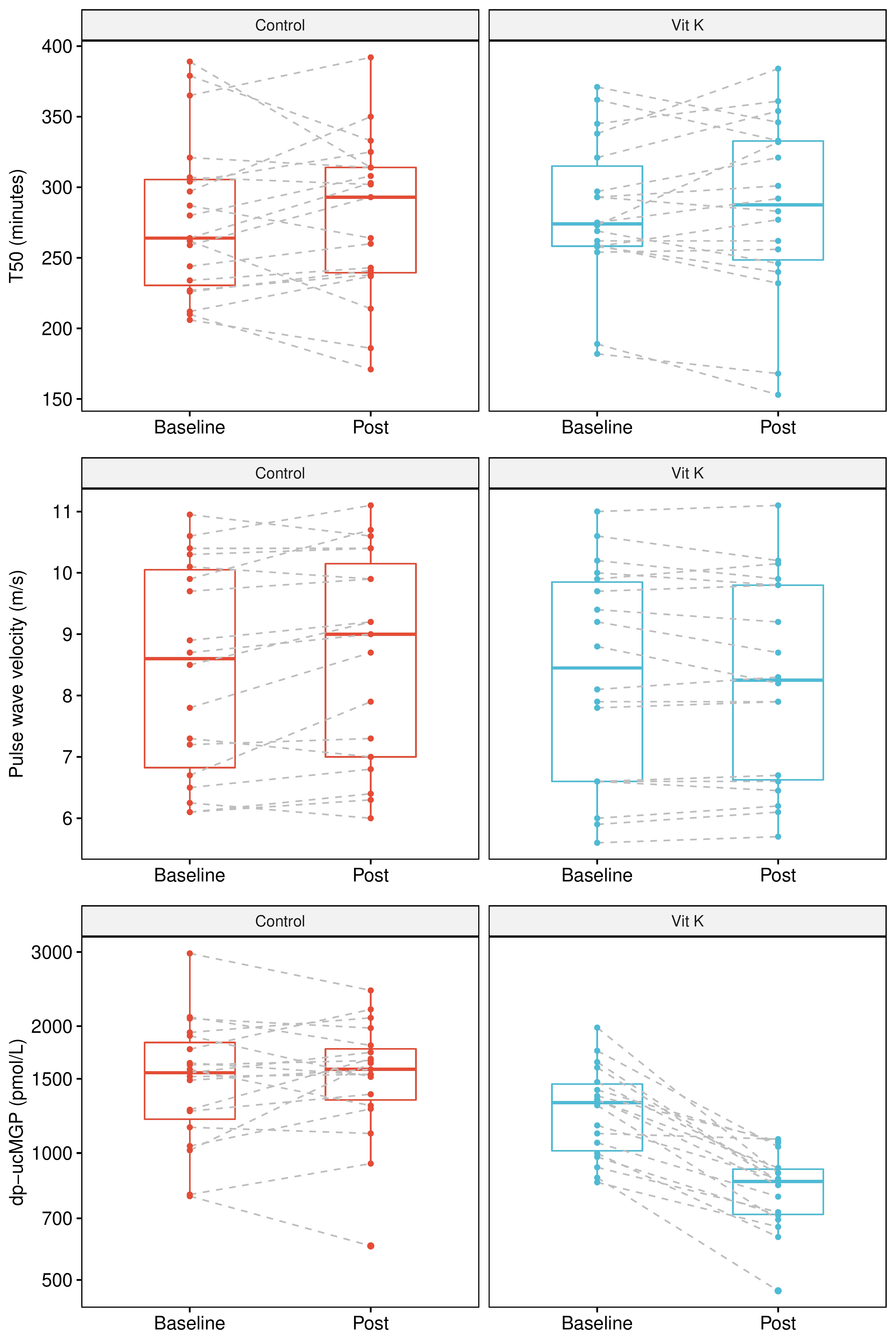 Discussion: Although vitamin K2-supplementation did not alter calcification propensity, we observed a significant beneficial treatment effect on vascular stiffness, suggesting that vitamin K2 may have local vascular effects in the absence of detectable systemic effects on calcification propensity. These results set the stage for studies addressing long-term intervention with vitamin K2 supplementation in KTR.