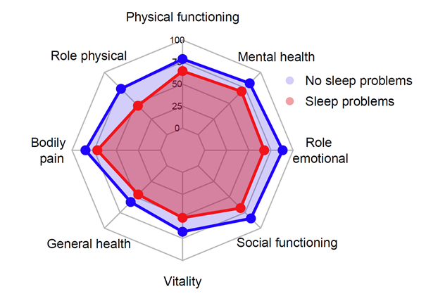 Results: We included 872 KTR (61.1% male, age 55.7±13.1y) with available data on sleep ≥1 year after transplantation, and 335 HC. In total, 16.7% of male KTR and 31.0% of female KTR reported poor sleep quality, which was significantly higher compared to HC (males: 8.8%, PChi-squared=0.017 and females: 15.5%, PChi-squared<0.001, (Figure 1). Next to female sex, more anxiety and calcineurin inhibitor usage were main determinants of poor sleep quality. Additional analyses suggested effect modification by age for the latter, and subgroup analyses confirmed that calcineurin inhibitors were associated with increased risk of poor sleep quality only in patients <57 years old (OR 6.14, 95%CI 1.87-20.15). Poor sleep quality was associated with more fatigue (st. β 0.34, P<0.001), lower ability to concentrate (st. β 0.27, P<0.001), poorer societal participation (restriction score: st. β -0.24, P<0.001), and lower HRQoL (physical component: st. β -0.32, P<0.001 and mental component: st. β -0.40, P<0.001, see Figure 2 for differences per subdomain of HRQoL) among KTR, which all remained independent of potential confounders. Longitudinal data in a subgroup of 124 participants showed that sleep quality improved after kidney transplantation in males (P<0.001), but not females (Figure 3).
