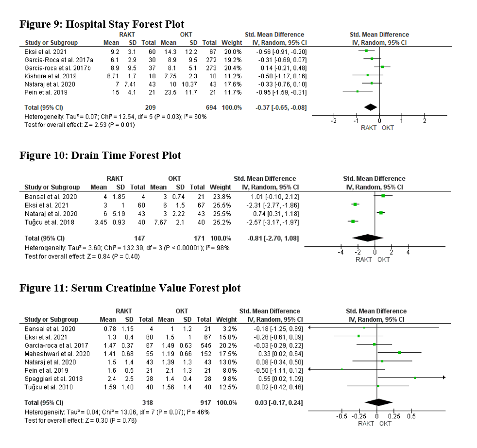 Results: 10 studies yielding 248 patients in the RAKT group and 750 patients in the OKT group were retained for analysis from 327 articles published between 2014 and 2021 that were generated from the database search and another snowballing. The differences in the functional outcomes were not significant across most studies. Of the intraoperative outcomes, pooled results revealed the warm ischemia time (WIT) (SMD = 0.15 [.03, .33], P= 0.11) and operating time (ORT) (SMD = 0.74[-0.01, 1.48], P=0.05) had no significant difference in the RAKT and OKT. The pooled rewarming time (RT), and total ischemia time (TIT) were, however, significantly higher in the RAKT compared to OKT, SMD=1.17[0.48, 1.85], P=0.0008 and SMD=0.87[0.29, 1.45], P=0.003 respectively, but there was no difference in pooled CIT SMD=0.37[0.13, 0.62], P=0.27. The blood loss, incision length and analgesics requirement were significantly lower in the RAKT condition compared to the OKT group at SMD=-0.56[-0.86,-0.27], P=0.0002, SMD=-4.38[-7.32, -1.43], P=0.004, and SMD=-5.75[-8.83, -2.67], P=0.0003 respectively. There was no significant difference for the evaluated postoperative outcome of drain time, and serum creatinine value, SMD=-0.81[-2.73,1.08], P=0.4, and SMD=0.03[-0.17,0.24],P=0.76 respectively, whereas the length of hospital stay and wound infections was smaller for RAKT SMD=-0.37 [-0.65,0.08], P=0.01, and OR 0.20 [0.06-0.62], P=0.006 respectively as shown in figures 1,2 and 3.