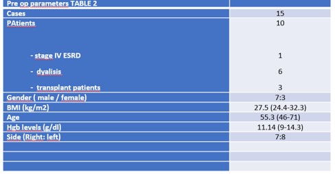 Results: with a study period of 2.5 years, 10 patients (Men: 7, Women: 3) underwent laparoscopic nephrectomy, performing a total of 15 nephrectomies. 4 underwent laparoscopic binephrectomy in 1 stage, 5 unilateral nephrectomy patients,and 1 binephrectomy patient in 2 stages. The surgical indications were: create space for the future transplant in 3 cases, recurrent urosepsis in 6 cases, and recurrent bleeding in 1 case. The preoperative parameters are shown in Table 1. Table 2 shows the perioperative evolution