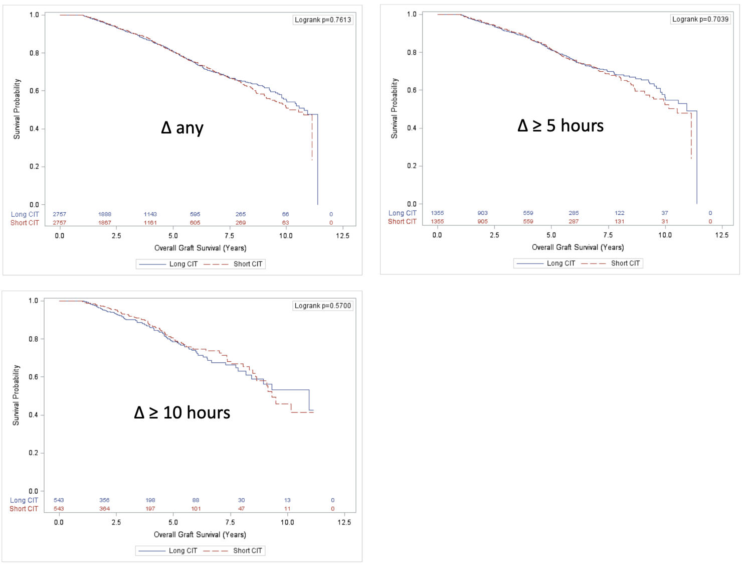 Results: Out of 20,059 DCD recipients, 14,545 were excluded for mate kidney non-transplantation, both or neither kidney developed DGF, missing CIT, or mate kidney recipients with equal CIT. The remaining 5,514 paired kidney recipients (2,757 donors) were analyzed. All donor and recipient characteristics were similar except for more non-locally shared kidneys, greater HLA mismatch, and longer pre-transplant dialysis duration in the longer CIT group. On multivariate analysis of DCD kidney recipients, overall graft survival was comparable between recipients with higher CIT relative to paired donor recipients with lower CIT when a CIT difference was present (adjusted hazard ratio [aHR] 1.04, 95% CI 0.91 to 1.19, n=5,514), 5 hours (aHR 1.04, 95% CI 0.85 to 1.27, n=2,710), or 10 hours (aHR 0.88, 95% CI 0.65 to 1.21, n=1,086). Between each of the 3 delta-CIT levels of shorter and longer CIT, there were statistically significant differences in the proportion of delayed graft function at delta any, 5, or 10 hours.
