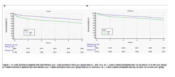 Results: Between 2015 and 2017, 1886 single kidney transplants were performed in 33 centers. Recipient and donor characteristics are shown in Table 1. In the current study, the incidence of DGF was 62%. Univariate analysis demonstrated that higher donor creatinine, donor age, recipient time on dialysis, donor BMI, absence of induction and cold ischemia time were risk factors associated with DGF. Multiple organ donation and cause of death other than stroke were associated with reduced risk DGF. In the multivariable analysis donor age (0.02), higher donor creatinine (0.02), recipient time on dialysis (<0.01), cold ischemia time (<0.01), monorganic donor (<0.01)) were risk factors of DGF. Renal function was significatively better in patients without DGF throughout the 5 years follow -up (p<0.05). Patients with DGF had higher incidence of acute rejection in the first three months of follow-up, with T-cell mediated rejection being the most frequent. At 3 and 5 years of follow up there was no increased risk of rejection when both groups were compared. Graft survival and patient survival were lower in the group that developed DGF at 1, 3 and 5 years of follow-up (<0.01) (Figure 1).
